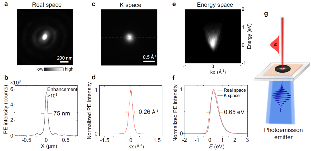 图3 hBN最低阶涡旋场模式的光电子发射响应:(a和b)实空间、(c和d)K空间、(e和f)能量分布;(g)光电子源示意图。