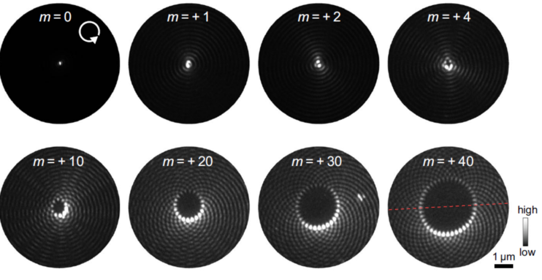 研究团队利用聚焦离子束刻蚀技术在hBN薄片上制备阿基米德螺线结构来构建矢量涡旋场。对于波长400nm附近的正入射光,当hBN厚度小于100nm时在hBN微纳结构中激发TE基模矢量涡旋场。利用PEEM实现了矢量涡旋场的超高空间分辨测量。PEEM测量其静态模式的原理是:根据光电效应,对于400nm 附近入射光,需要吸收两个光子克服功函数使电子逸出样品表面,光发射电子强度PE正比于结构表面局域电场强度I的平方,因此光发射电子信号强度直接反应该处近场强度。实验揭示了0 ~ 40阶涡旋场静态模式分布,如图2所示,特别是对于最低阶涡旋场,可实现远超衍射极限的聚焦(60–80nm),得益于hBN材料的低损耗特性,可实现该聚焦点光发射电子信号强度103倍至104倍的增强。