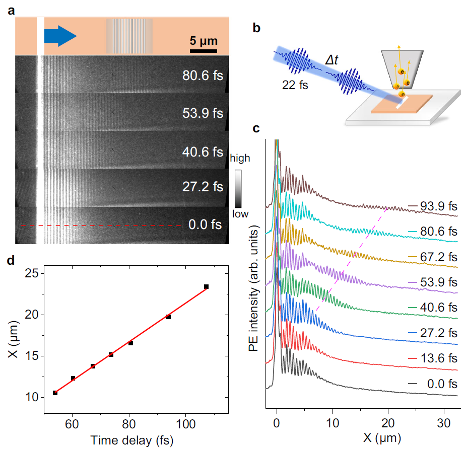 图1 hBN波导近场模式的超快时空演化。(a)TR-PPEM测得的波导模式时空演化;(b)TR-PEEM测量原理图;(c)波包随时间延迟的演化;(d)波包中心随时间延迟的演化。