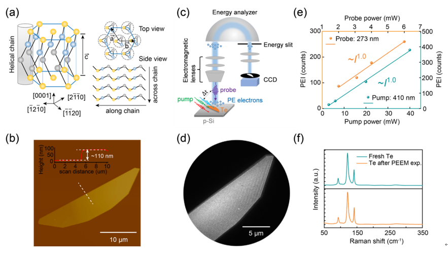 飞秒-纳米时空分辨光电子显微镜因其超高时空分辨能力常被用于材料的超快动力学研究,探索载流子动力学对理解材料的物化性质以及器件应用起到关键作用。随着各种新型二维材料的出现,以硼烯、硅烯、磷烯等为例的单元素二维材料以其奇特的光电特性以及广泛应用前景在近年来受到大量关注。其中,具有手性链结构的二维单元素半导体碲纳米片具有独特的电子结构以及拓扑性质,基于其的场效应晶体管、调制器以及光探测器等器件也已经被实现,理解二维碲纳米的载流子动力学对其基础研究以及器件应用具有关键作用。