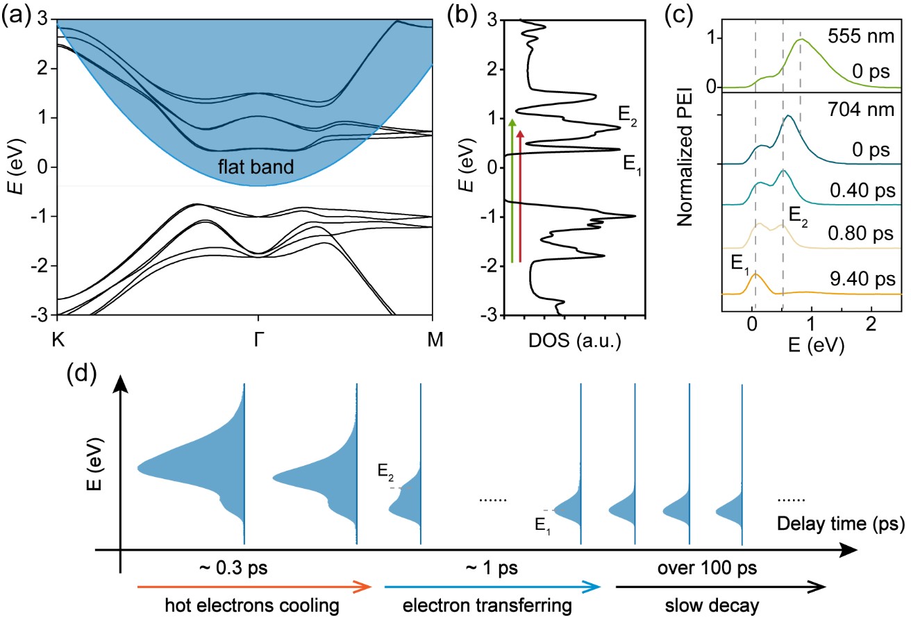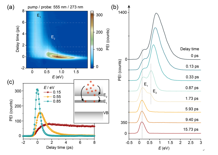 为确认猜想,研究团队进一步结合能量分辨光电子显微镜得到碲纳米片中激发态电子的时间变化能谱。在555 nm激光泵浦下的时间变化能谱中可以明显看到两个分立的能级E1和E2(图3)。在前1 ps中,被激发到高能级导带的激发态电子冷却到低能级,因而时间变化能谱的高能峰在前1 ps发生明显的红移。为了更加准确地得到各个导带能级上电子弛豫的快慢,研究团队提取了0 ps时的高能峰以及两个子带上的激发态电子数量变化曲线,得到了0.3 ps左右的超快热电子冷却过程、大约1 ps左右的电子带间跃迁过程以及百ps量级的慢弛豫过程。考虑到Gamma点并不是导电的最低点,慢过程可能由于是电子辐射复合回到价带或者是向更低导带能级散射。该实验系统的时间分辨能力大约是200 fs,能量分辨能力大约是150 meV。