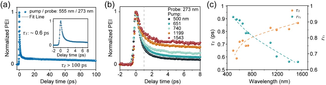 研究团队利用水热法合成的百纳米厚度(约110 nm)的二维碲纳米片具有原子级平整表面,在高激光强度照射以及超高真空测试条件下,保持稳定的光学特性。实验发现,碲纳米片的载流子动力学和泵浦波长紧密相关,随着泵浦波长的增加,快过程(<1ps)弛豫变慢,占比变少(图2)。由此推断碲纳米片的载流子动力学与激发态电子所处导带能级相关。