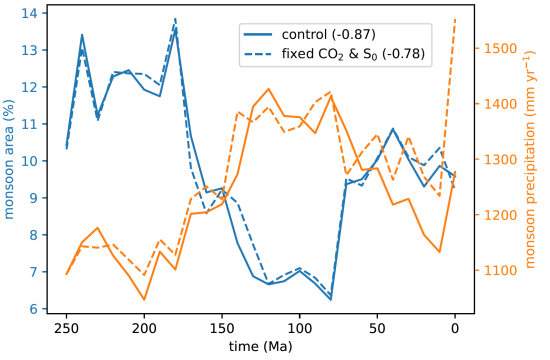 图2、过去2.5亿年全球陆地季风区面积(蓝色线)和季风降水强度(橘黄色线)的变化。左侧垂直坐标是陆地季风区面积占地球表面积的百分数,右侧垂直坐标是陆地季风区年均降水量。实线代表控制试验结果,虚线代表固定CO2浓度和太阳常数试验结果。