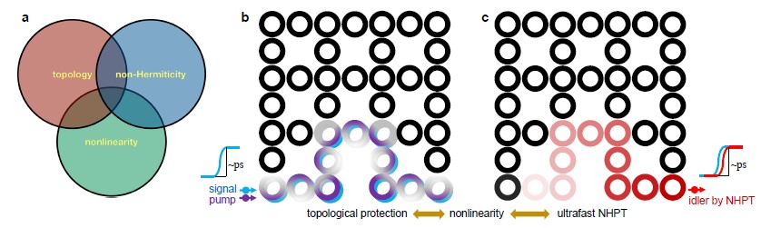 拓扑、非厄米和非线性均为光学领域的研究焦点,但具有截然不同的物理图像和应用。其中,拓扑光子学向非厄米领域的延伸不仅仅展示了多重相之间新奇的协同和相变物理现象,还成功实现了拓扑激光、拓扑纠缠光源以及非厄米诱导可重构拓扑光子器件等。另一方面,光学非线性在材料中普遍存在并具有快速可控的特点,因此常被用来操控“增益-损耗”类型的非厄米光学器件。近年来,非线性光学也被应用到拓扑光子器件的调控中,例如观察到了非线性诱导的拓扑相变和非线性弗洛凯拓扑孤子等。而拓扑、非厄米与非线性的三者结合可以融合各自的优势,有可能带来新物理和重要应用。