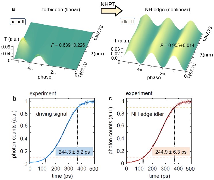 通过路径干涉和时域调控实验,合作团队还分别证明了非厄米边界传输信道的光学相干性的恢复、达到了非线性调控的百皮秒级快速非厄米相变时间(图2)。通过将该拓扑器件与拓扑平庸器件进行实验和理论的对比,非厄米传输边界态的鲁棒性也得到了展示。该工作为具有强非线性的光学材料中多重相间的快速能带调控提供了一种新方法,有望发展出具有拓扑鲁棒、高速调控的光量子器件。团队前期还发展出了拓扑保护的量子纠缠光源(Nature Photonics16, 248-257 (2022))。拓扑量子器件的研究有望应用于研制大规模集成的大尺度光量子计算器件与芯片,探索量子体系的拓扑物理和现象等。