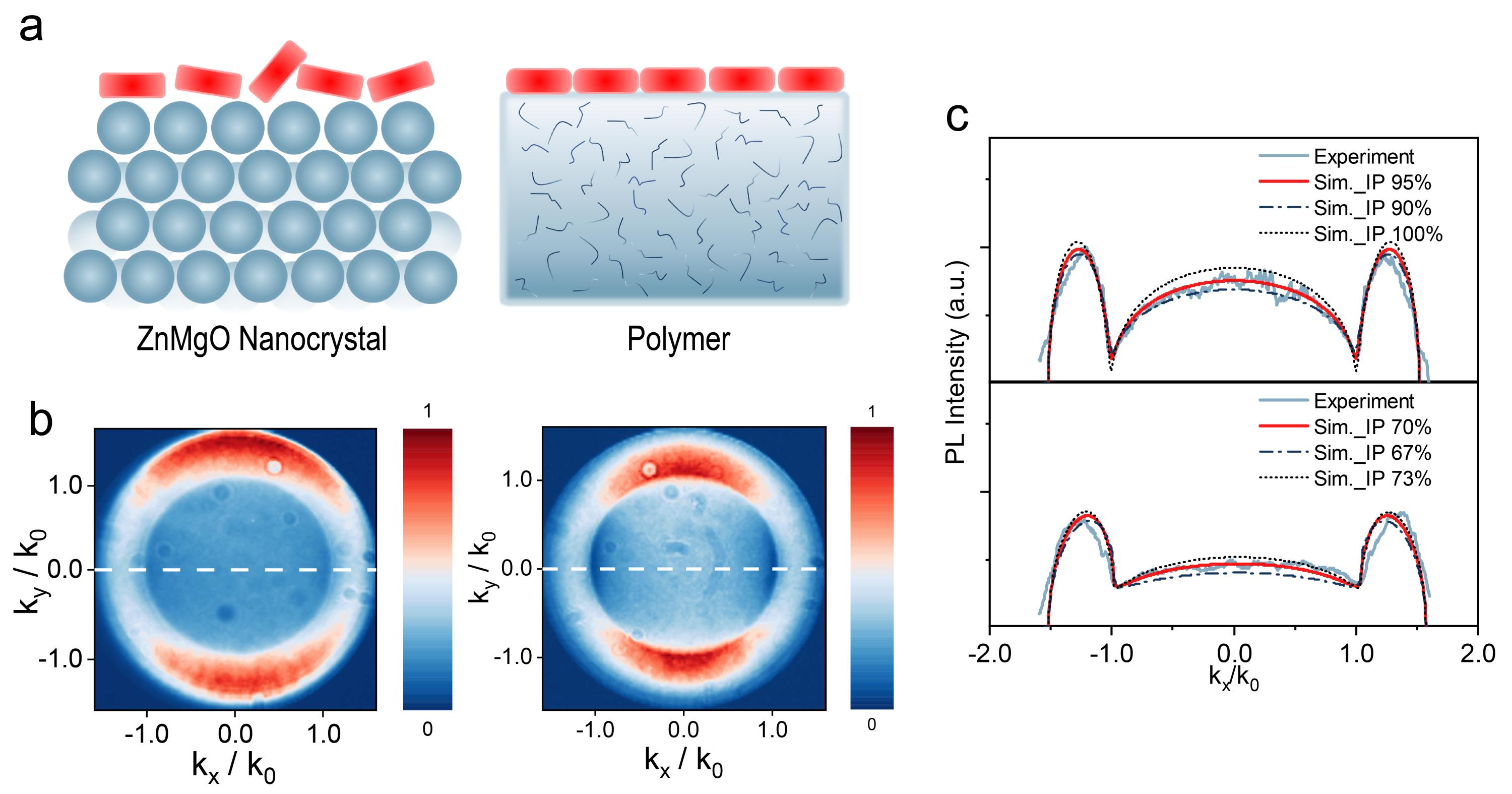 基于纳米晶的发光二极管具有低成本、高发射效率、窄光谱、长寿命等优点,因而在下一代高清显示技术与照明应用中均具有巨大潜力。此前,纳米晶-发光二极管领域已取得了重大进展,展现了接近30%的高外量子效率和超过10,000小时的寿命。然而,器件中外量子效率的进一步提升受到了外耦合因子的限制,这是决定器件最大光提取效率的关键参数。各项同性纳米晶的垂直跃迁偶极矩动量因与金属电极产生较强的耦合并以等离激元模式损失了大部分能量。因此,提高水平跃迁偶极矩动量分布一直被认为是提升外量子效率的重要方法,图1。