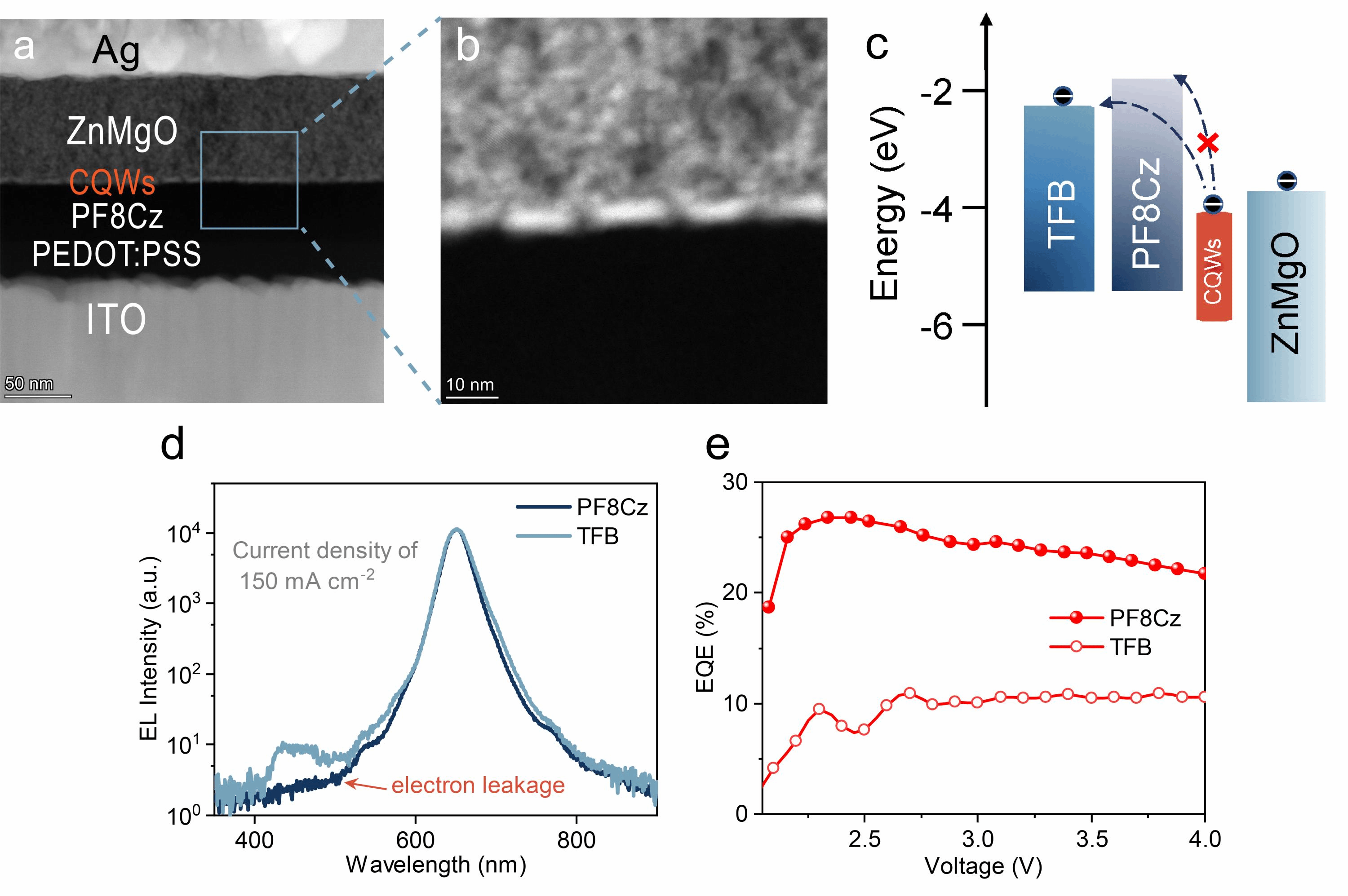 图3. a) 量子阱器件的HADDF-STEM横截面图像。 b)放大图。 c)基于TFB或PF8Cz器件中的电子传输示意图。 d)电致发光光谱。 e)外量子效率-电压曲线。