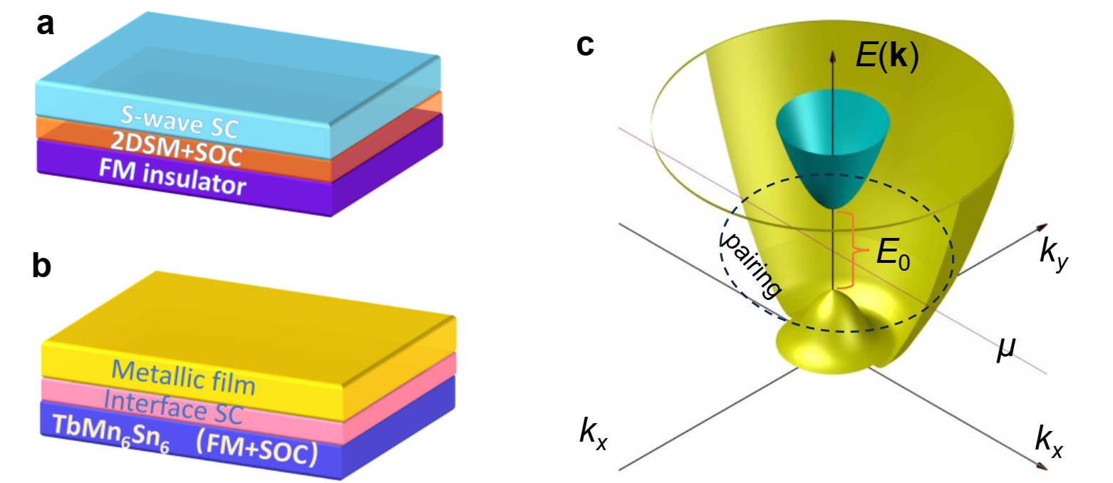 图2 TbMn6Sn6/非超导金属异质结构界面超导的理论图像。as波超导体(SC)/具有Rashba自旋轨道耦合(SOC)的二维半导体(2DSM)/铁磁(FM)绝缘体堆叠层中通过近邻效应诱导的拓扑超导理论示意图。bTbMn6Sn6/金属异质结构中产生界面超导的示意图。c图b所示界面超导的色散关系示意图。其中E0是塞曼能隙,虚线圆标记的‘pairing’是指当化学势μ处于E0中时,在外侧能带中形成的超导库珀对。