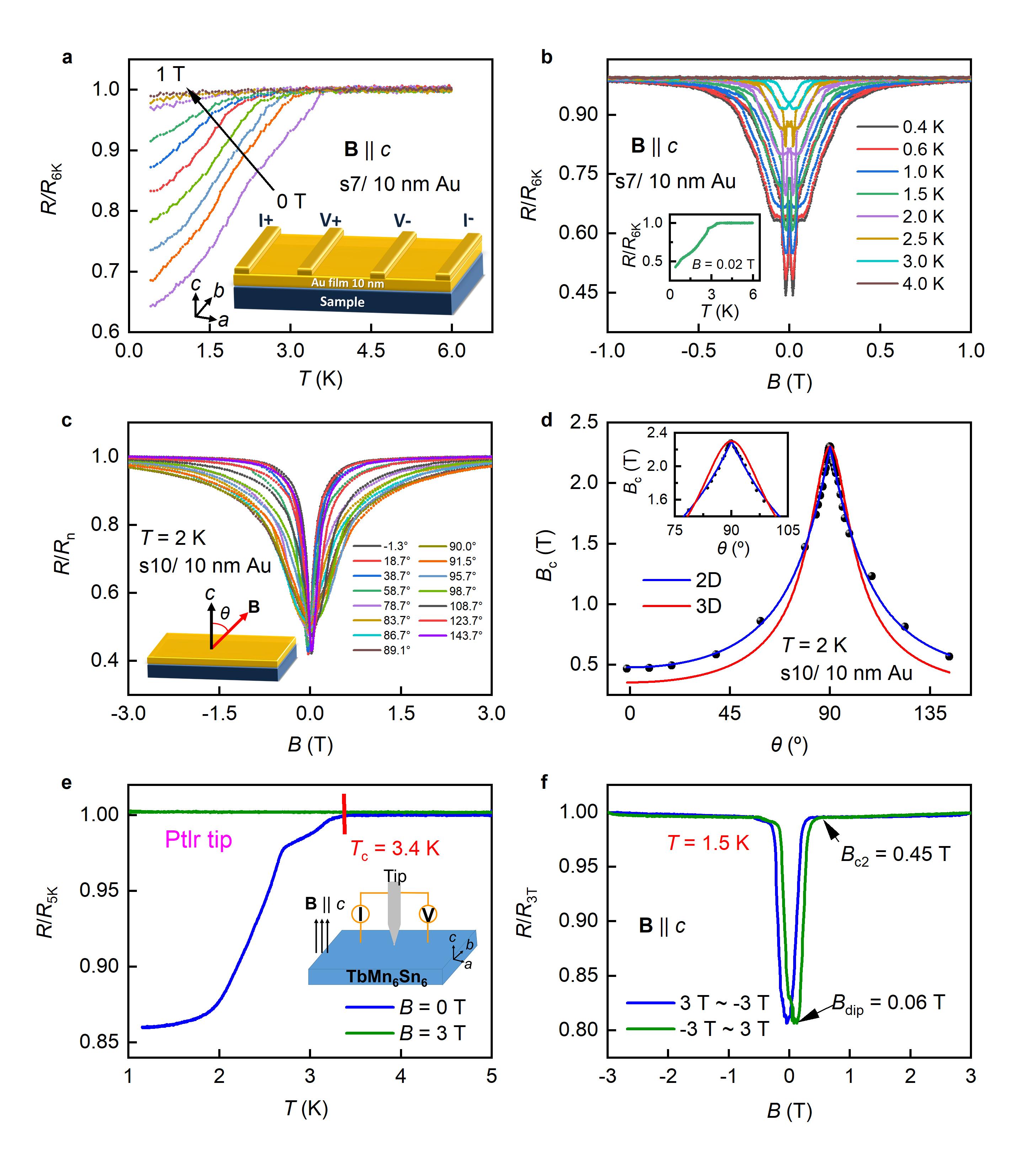 图1 TbMn6Sn6/非超导金属异质结构的超导电性。a通过标准四电极法检测的TbMn6Sn6(s7)单晶(001)表面蒸镀10 nm 厚Au膜的超导电性证据。磁场沿平面外方向(B||c轴)施加。其中B= 0 T, 0.12 T, 0.145 T, 0.175 T, 0.21 T, 0.25 T, 0.3 T, 0.45 T, 0.7 T, 和1 T。b在不同温度下(B||c轴)对覆盖有10 nm Au膜的s7的磁阻测量。插图:在0.02 T下归一化电阻的温度依赖性。0.4 K时电阻下降到R6K的近40%。c2 K下TbMn6Sn6样品(s10)覆盖10 nm厚Au膜的磁场转角磁阻曲线。其中θ是磁场与TbMn6Sn6样品c轴之间的角度。Rn是3 T时B||c轴的磁阻。d覆盖10 nm厚金膜的s10样品的临界磁场随磁场与样品夹角的变化曲线(Bc(θ)),表明观测到的超导具有准二维的特征。ePtIr金属针尖与TbMn6Sn6单晶的(001)面形成的点接触界面的归一化点接触电阻(R/R5K),在零场(蓝色,B= 0 T)和非零场(绿色,B= 3 T)下随着温度的变化曲线。插图:点接触示意图,磁场以沿着垂直方向(B||c轴)。f图e的点接触态的磁阻曲线具有磁滞现象。