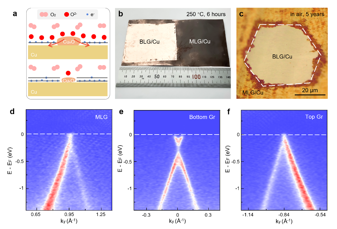 欧冠官方网站凝聚态物理与材料物理研究所、人工微结构和介观物理国家重点实验室刘开辉教授与上海科技大学王竹君教授等合作者揭示了铜上双层石墨烯的双面各异掺杂机制,成功实现了对铜箔的超高效防腐,可在200 ℃下保护铜箔1000小时以上,达到了工信部《重点新材料首批次应用示范指导目录》中要求的1000倍,有望拓展铜在高温、高湿等极端环境下的应用前景。2023年11月17日,相关研究成果以“双面各异掺杂双层石墨烯增强铜抗腐蚀性能”(Enhanced copper anticorrosion from Janus-doped bilayer graphene)为题,在线发表于《自然·通讯》(Nature Communications)。