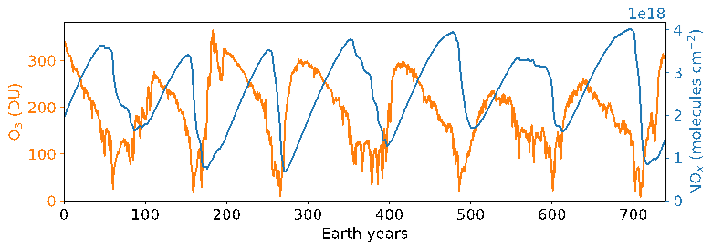 图1. 臭氧柱含量(橘黄色线)与氮氧化物总含量(蓝色线)协同的周期性振荡。