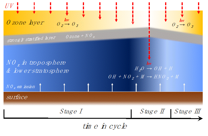 图2给出的是辐射-光化学-热力-动力相互耦合并形成臭氧振荡的示意图。在红矮星紫外辐射的作用下,氧气光解在大气平流层形成臭氧层。与此同时,行星表面排放的NOx不断在大气中累积。臭氧吸收紫外辐射形成逆温层,并在臭氧层底部形成稳定的热力层结(灰色区域)。行星表面排放的NOx进入该区域,不断地消耗臭氧,导致该稳定层结区向上移动,更多地消耗臭氧(Stage I),直至该稳定层结被破坏,绝大部分臭氧被消耗(Stage II)。当只有很少臭氧时,紫外辐射可以到达对流层,导致水汽光解形成OH,后者与NO2反应,形成HNO3并沉降出去,导致NOx减少。当大气NOx减少时,臭氧开始恢复(Stage III)。