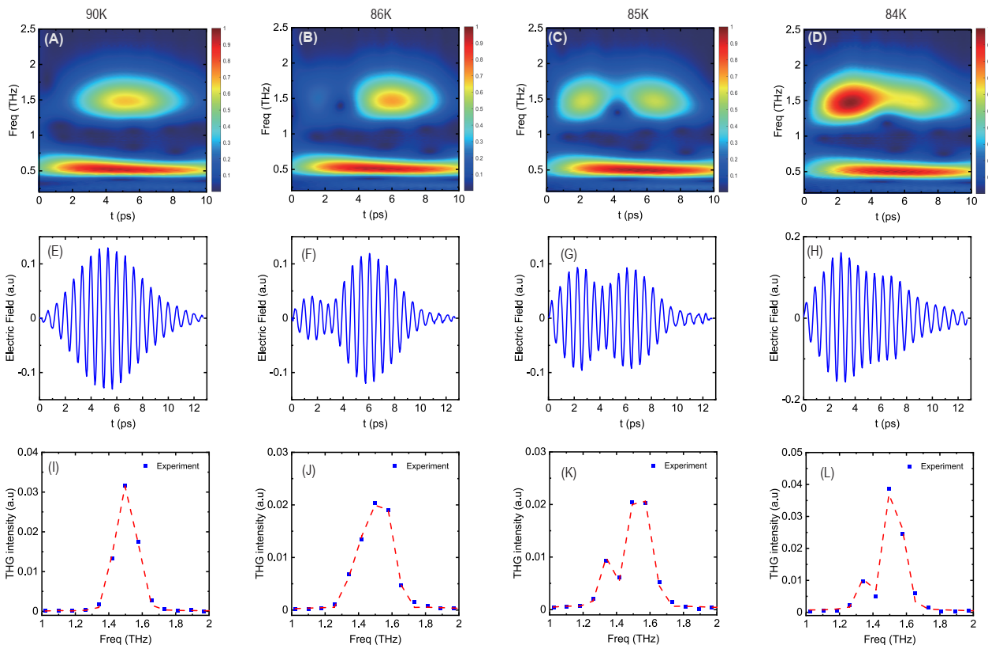图2:Tc=87 K最佳掺杂超导体的太赫兹驱动实验,基频驱动脉冲能量为0.5 THz。(A)-(D)强场太赫兹通过样品后的时频分析;(E)-(H)数字滤出1THz以上的信号,可以看到随温度降低,Tc以下三倍频信号出现拍频,在更低温度拍频消失;(I)-(L)为(E)-(H)的傅里叶变换,Tc以下三倍频信号产生劈裂。这是两个不同起源的三倍频信号有相互作用导致的能量劈裂。