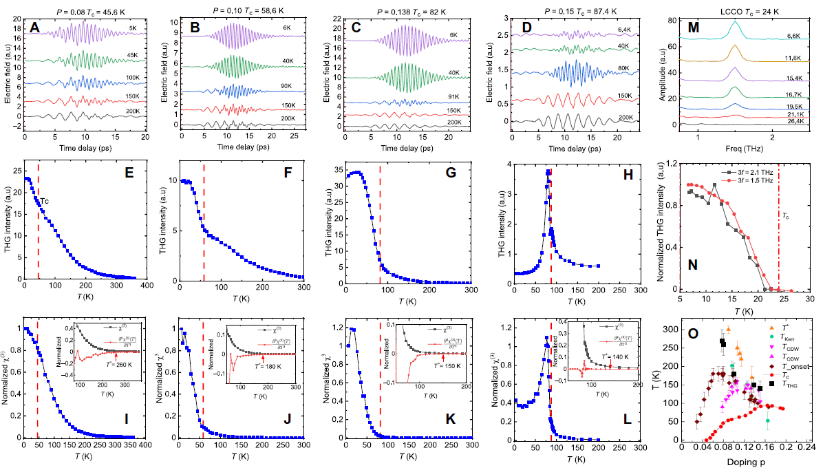 图1:不同掺杂YBCO薄膜样品和最佳电子型掺杂LCCO薄膜样品的太赫兹三次谐波谱测量。(O)图为太赫兹三次谐波谱定义的特征温度TTHG,该温度在宽掺杂区间内和赝能隙温度T*趋势一致。