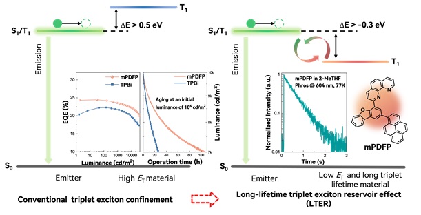 针对此两难问题,欧冠官方网站人工微结构和介观物理国家重点实验室研究团队设计了一种新的电子传输材料,其三线态能量比发光材料的低0.32eV,结果却表现出优异的能量限域效应,且器件的寿命比常用材料TPBi(其三线态能量比发光材料高0.36eV)的高4.9倍。分析表明,这一反常结果源于电子传输材料异常长的三线态激子寿命(~0.2s),它可以长时间储存激子,并通过吸热能量转移而表现出一种激子循环限域能力。研究团队将其命名为长寿命三线态激子中转库(LTER)效应(图1)。结果表明,低三线态能量和长寿命的结合提供了与高三线态能量类似的优异的激子限域能力,同时保证了极好的分子稳定性。这将成为解决高三线态能量和分子稳定性之间的两难困境的可能途径,并有望为突破蓝光OLED的高效率和长寿命之间的困境提供一种新的分子设计范式。