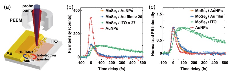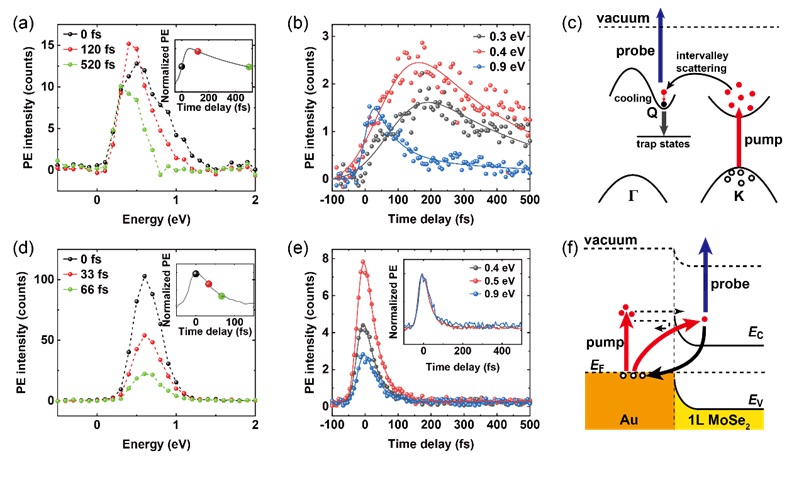 进一步结合能量分析仪,获得了界面处的时间分辨能谱以及能量分辨的动力学曲线(图2)。观测结果表明在氧化铟锡基底上的二硫化钼热电子存在冷却过程,而在金纳米颗粒上二硫化钼的热电子几乎没有冷却过程,证明在金与单层过渡金属硫族化合物之间电子直接转移占主导。