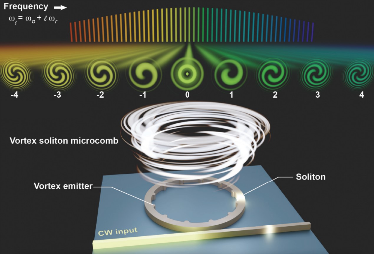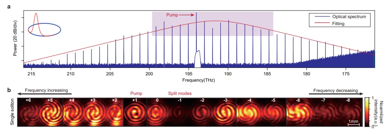 近日,欧冠官方网站现代光学研究所、人工微结构和介观物理国家重点实验室、纳光电子前沿科学中心“极端光学创新研究团队”杨起帆研究员、刘文静研究员、肖云峰教授以及龚旗煌院士等人合作,在实验上首次基于光子芯片获得了携带轨道角动量特性的光学频率梳。2024年3月29日,相关研究成果以“集成涡旋孤子微梳”(Integrated vortex soliton microcombs)为题,发表于《自然•光子学》(Nature Photonics)。