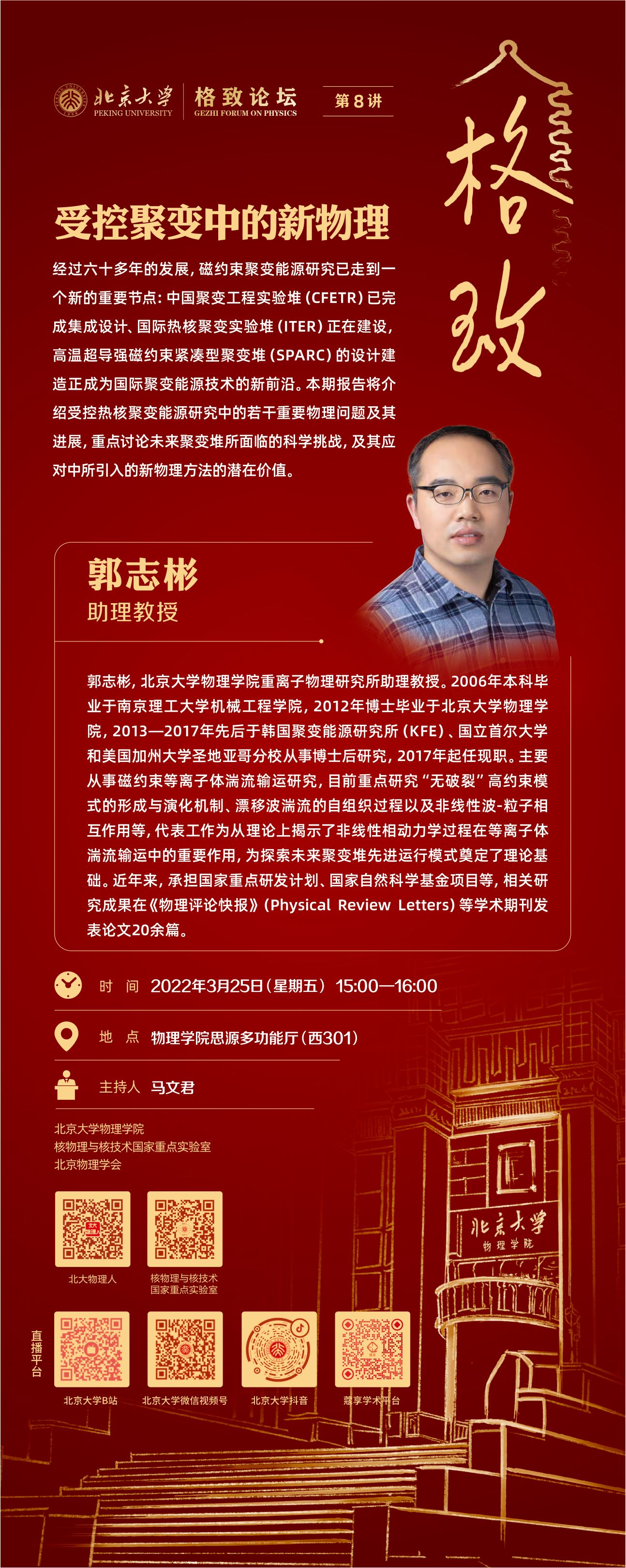 主讲人简介: 郭志彬,欧冠官方网站重离子物理研究所助理教授。2006年本科毕业于南京理工大学机械工程学院,2012年博士毕业于欧冠官方网站,2013—2017年先后于韩国聚变能源研究所(KFE)、国立首尔大学和美国加州大学圣地亚哥分校从事博士后研究,2017年起任现职。主要从事磁约束等离子体湍流输运研究,目前重点研究“无破裂”高约束模式的形成与演化机制、漂移波湍流的自组织过程以及非线性波-粒子相互作用等,代表工作为从理论上揭示了非线性相动力学过程在等离子体湍流输运中的重要作用,为探索未来聚变堆先进运行模式奠定了理论基础。近年来,承担国家重点研发计划、国家自然科学基金项目等,相关研究成果在《物理评论快报》(Physical Review Letters)等学术期刊发表论文20余篇。