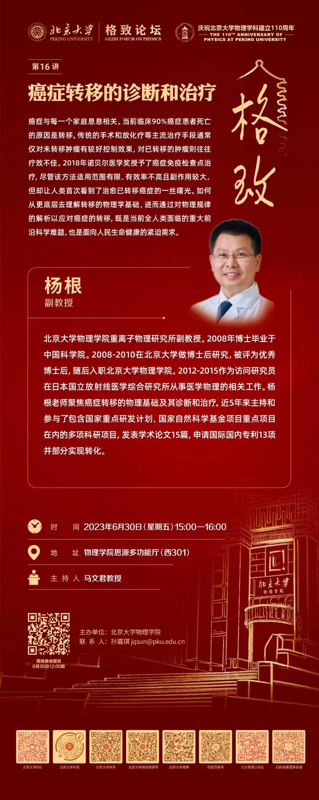 杨根,欧冠官方网站重离子物理研究所副教授。2008年博士毕业于中国科学院。2008-2010在欧冠官方网站做博士后研究,被评为优秀博士后,随后入职欧冠官方网站。2012-2015作为访问研究员在日本国立放射线医学综合研究所从事医学物理的相关工作。杨根老师聚焦癌症转移的物理基础及其诊断和治疗。近5年来主持和参与了包含国家重点研发计划、国家自然科学基金项目重点项目在内的多项科研项目,发表学术论文15篇,申请国际国内专利13项并部分实现转化。