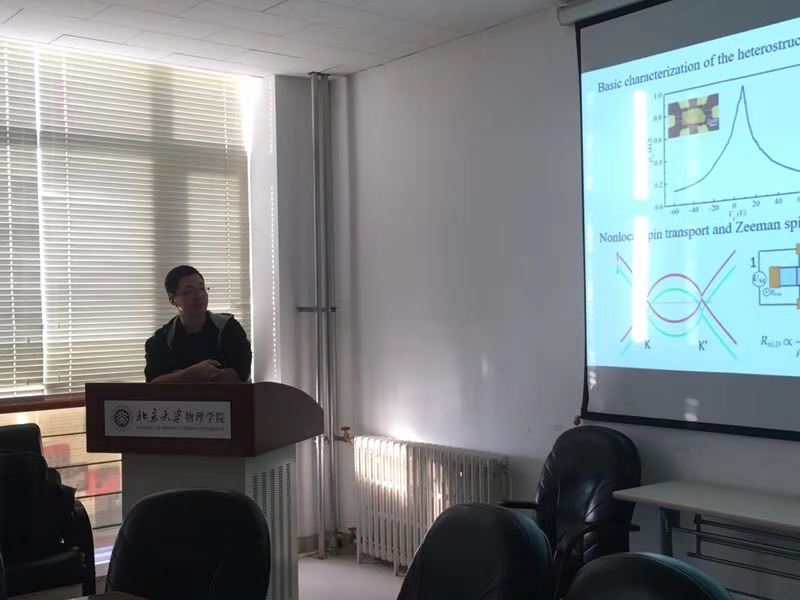 第二位主讲人是14级凝聚态博士生宋化鼎。宋化鼎师兄师从廖志敏教授和俞大鹏院士,主要从事石墨烯异质结等体系的低温强磁场输运实验研究。他在科研上也有出色的成果,已发表SCI论文6篇,其中第一作者或并列一作的论文4篇,发表在Nano Letters、Physical Review B、Applied Physics Letters等期刊上。本次报告他从目前很有应用前景的二维材料石墨烯出发,向大家介绍了他的工作,利用铁酸铋中的铁电性与铁磁性存在自发的磁电耦合,实现了外电场对石墨烯-铁酸铋的磁近邻效应的调制。