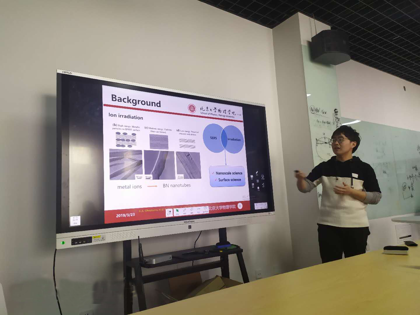 胡召一师兄是应用核物理专业的博士生,主要从事应用核物理方向相关的研究,包括核材料的离子束辐照效应、新型耐辐照材料的探索研发、以及纳米材料的辐照改性等方面。入学两年半的时间里,已经以第一作者发表论文四篇(含一篇合作);连续两年获得欧冠官方网站“三好学生”奖励及奖学金;获选出席2019德国林岛诺贝尔奖获得者大会(全国物理学当年挑选25人);2018年7月在中国材料大会纳米多孔材料分会场做口头报告,并获得核材料分会场优秀海报奖。今天胡师兄给大家带来了题为“离子辐照提升纳米多孔铜基底表面增强拉曼效应”的报告,报告中师兄跟大家介绍了自己最近的一些研究成果,分享了自己的科研思路和想法来源,并鼓励大家要自信,用批判思维去阅读文献。