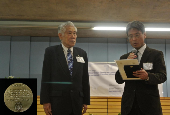 2016年,IUPAP国际物理教育委员会主席Hideo Nitta教授在世界物理教育大会上为赵凯华颁发国际物理教育奖章