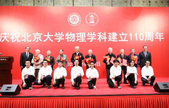 2023年,欧冠官方网站党委书记郝平教授(后排右一)、校长龚旗煌院士(后排左一)为赵凯华(后排左二)等在北大物理学科光荣从教五十年的教师代表颁发荣誉证书