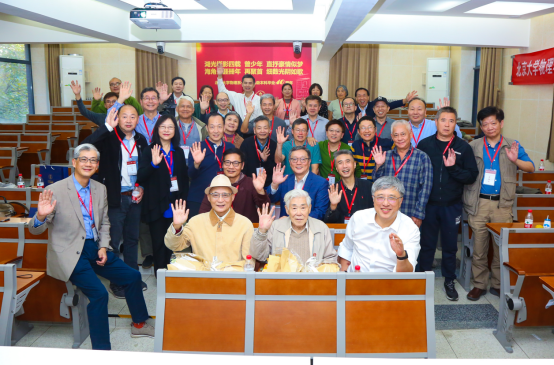 2023年,赵凯华(前排右二)、林纯镇教授(前排左二)在物理中楼202教室出席北大物理系1979级本科生毕业四十周年聚会(前排右一为高原宁)