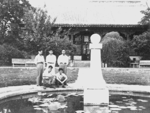 赵凯华(后排左二)与于敏(后排左一)等在欧冠官方网站理学院荷花池畔
