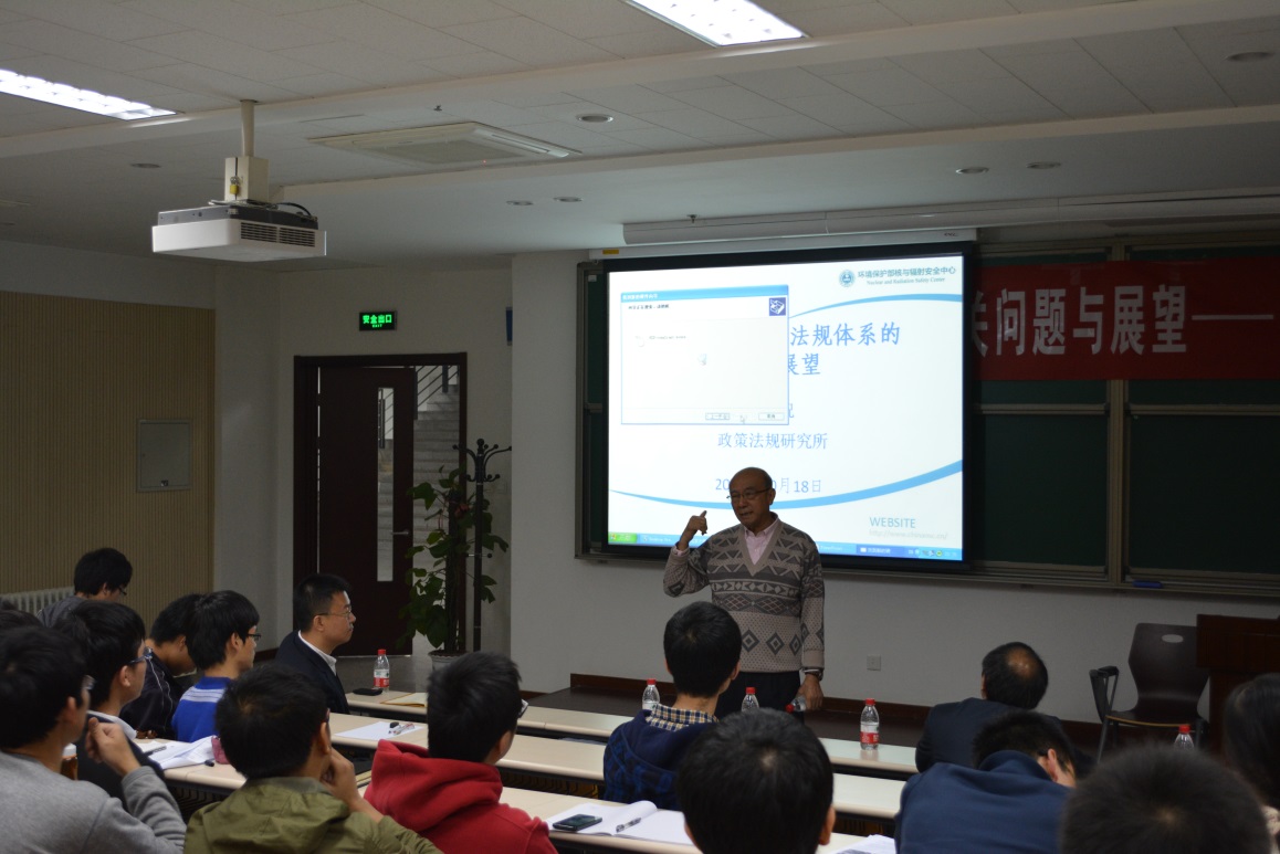 其次,85级气象学专业的张天祝学长给大家作报告,他现在担任环保部核与辐射安全中心政策法规研究所所长。他从核安全法律法规体系这一方面给大家阐述了核安全的监管体制方法等,让我们在决心投身核事业的时候明确关键所在。