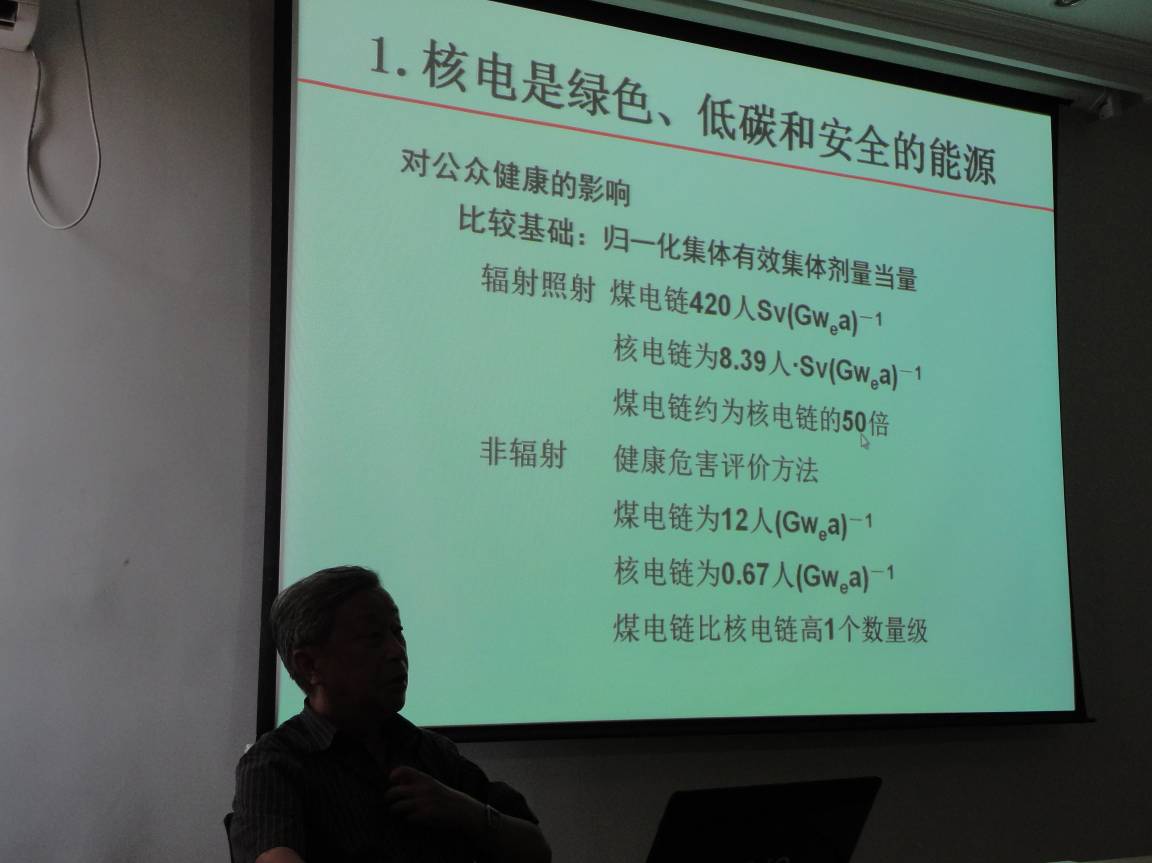 中国工程院潘自强院士的报告题目为《发展核电是解决我国能源可持续发展的现实途径》,报告由以下几个部分组成:1、核电是绿色、低碳和安全的能源;2、安全积极发展核电是我们能源的长期战略选择;3、吸取福岛核电站的教训,进一步提高核电的安全水平;4、重视核与辐射事故(事件)社会问题的研究。潘院士指出不论是对于公众健康还是对于环境的危害,煤电链均远远大于核能链,煤电链的辐射照射为相应核能链的50倍,非辐射危害比核能链高一个数量级,而核能的温室气体排放仅约为煤的1%。目前,我国已建成了较完整的核与辐射法规体系、监管单位及研究机构,并组织编制核安全规划。福岛核事故对我国环境和居民健康没有影响,对世界的影响不大于切尔诺贝利核事故的1%。我国应建立事故发生前的信息管理机制。