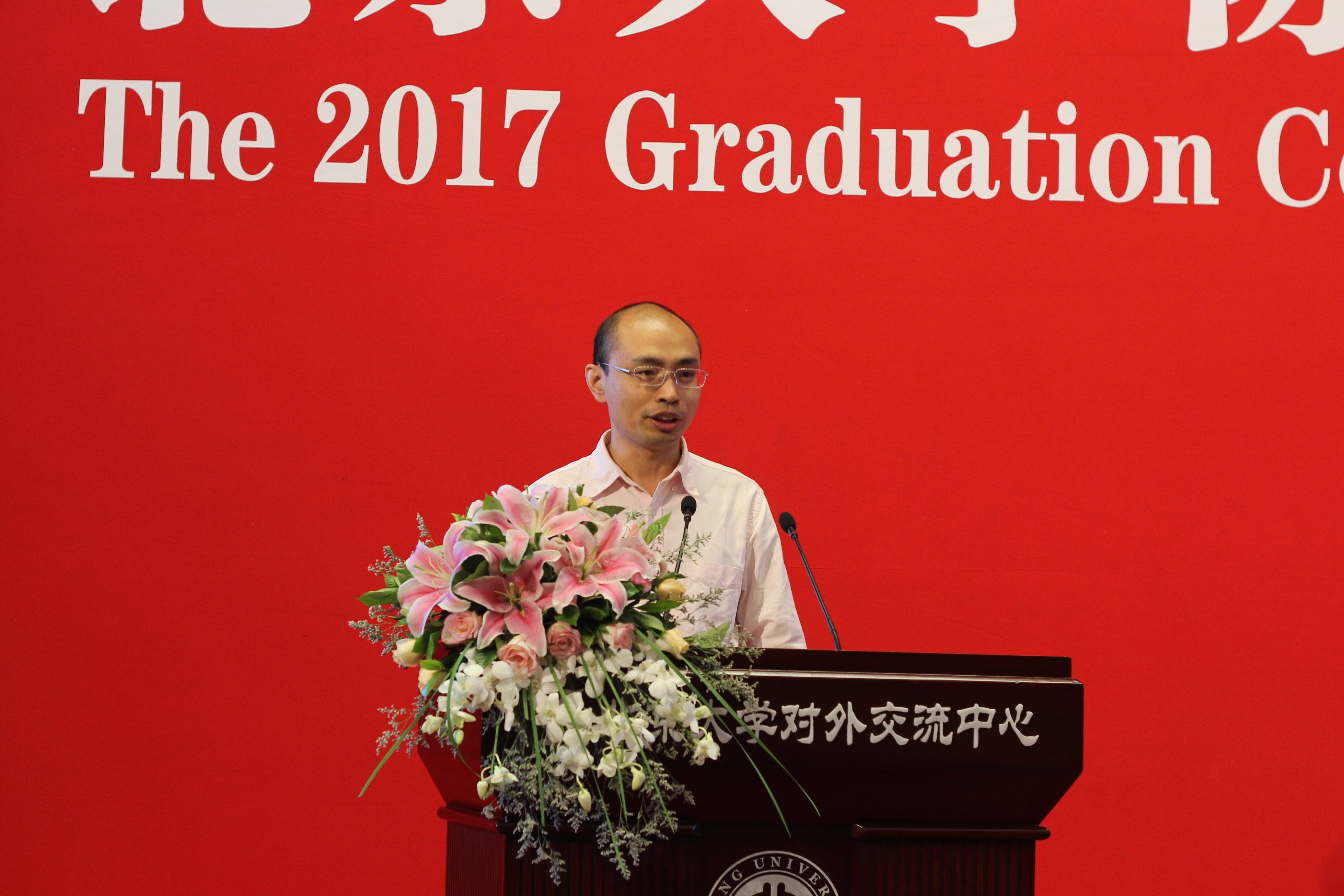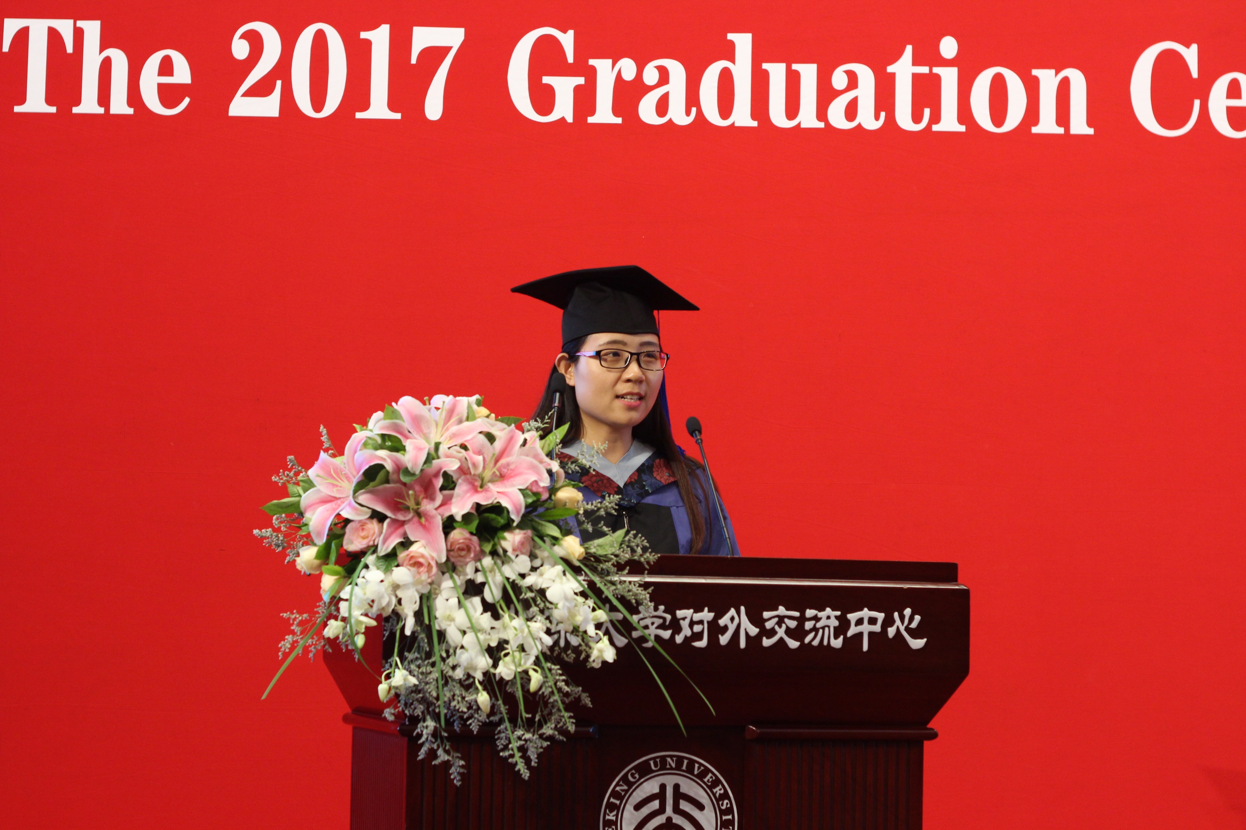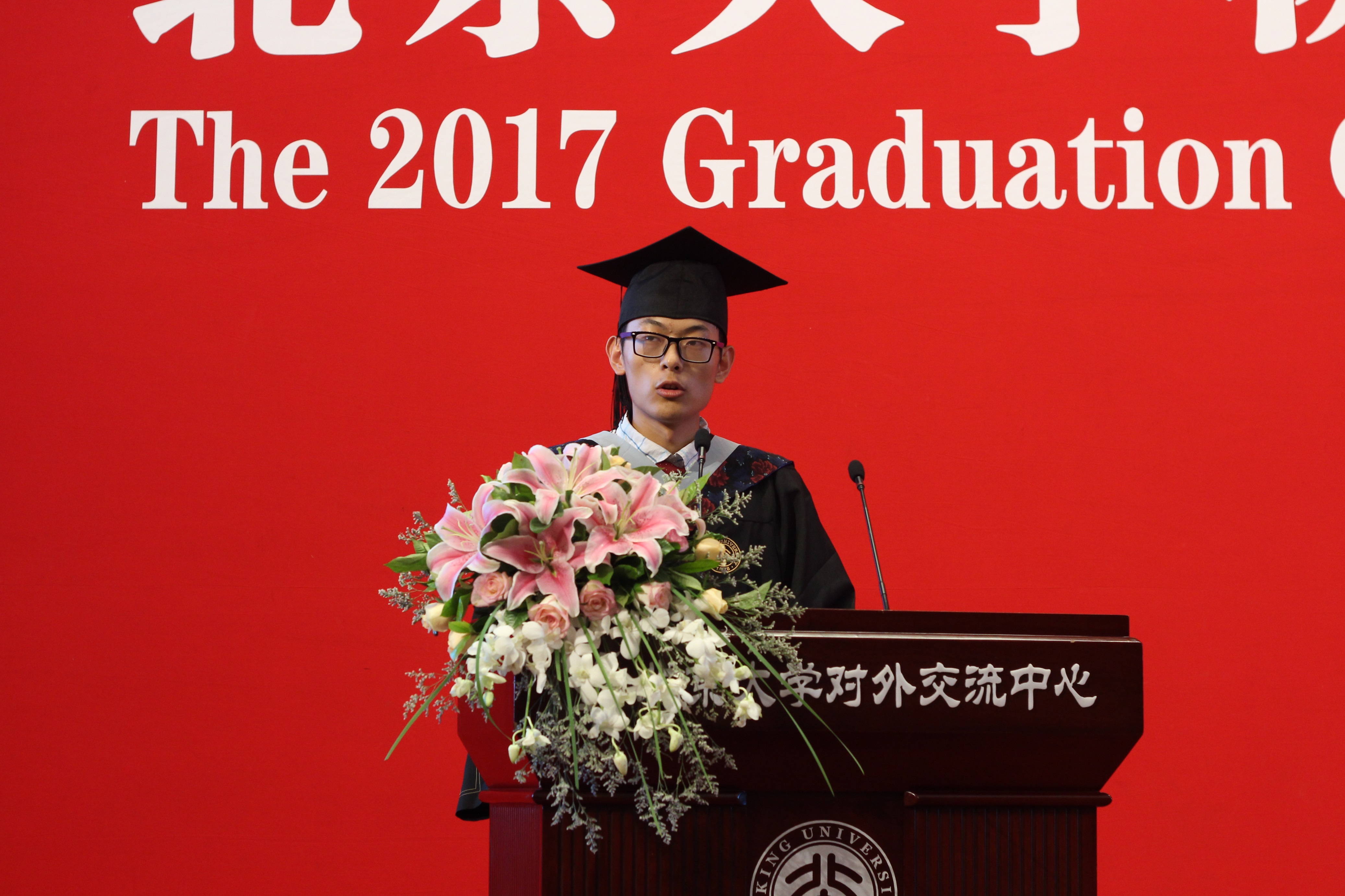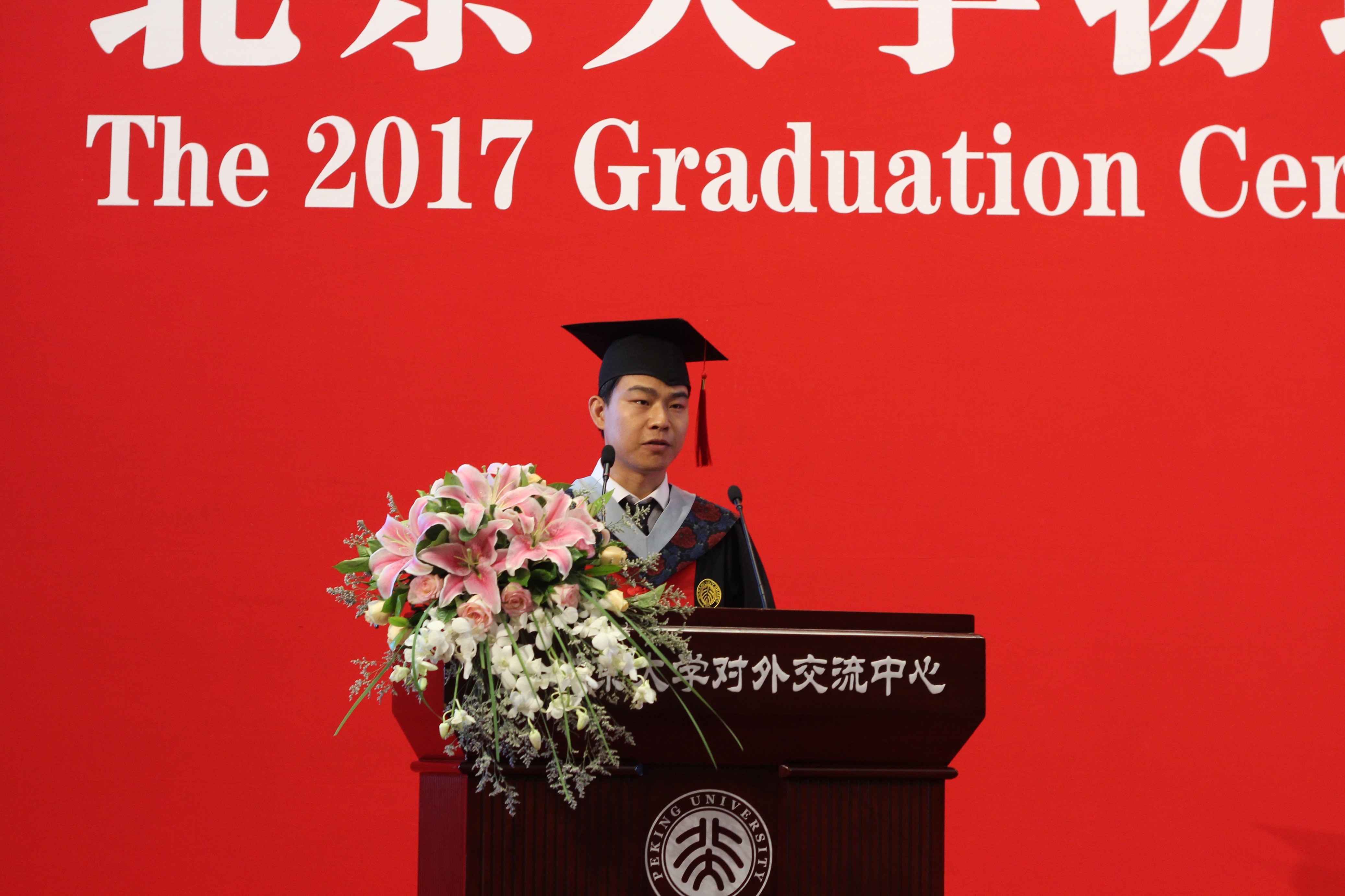 周林女女士代表全体2017届毕业生家长致辞。周林女女士代表家长深情地感谢了学院老师们对儿女们的关怀教育,表达了对儿女们成材的骄傲和对他们未来的祝福。在典礼的最后,作为2017届毕业生的代表,本科生马骏超、硕士生国维维、博士生王猛先后发表了毕业感言,畅谈了在燕园几年来的体悟。马俊超提醒同学们反思当初“数不清的梦想实现了多少”,国维维分享了自己如何从一次次挫折中学会享受不完美,希望大家“不为模模糊糊的未来担忧,只为清清楚楚的现在奋斗”,王猛则以“科研中,挫折多于成就”,但不要因为挫折就止步不前的言辞鼓励大家在接下来的道路中继续砥砺前行。三位同学一番朴实而饱含真情的发言,赢得了全场的掌声。