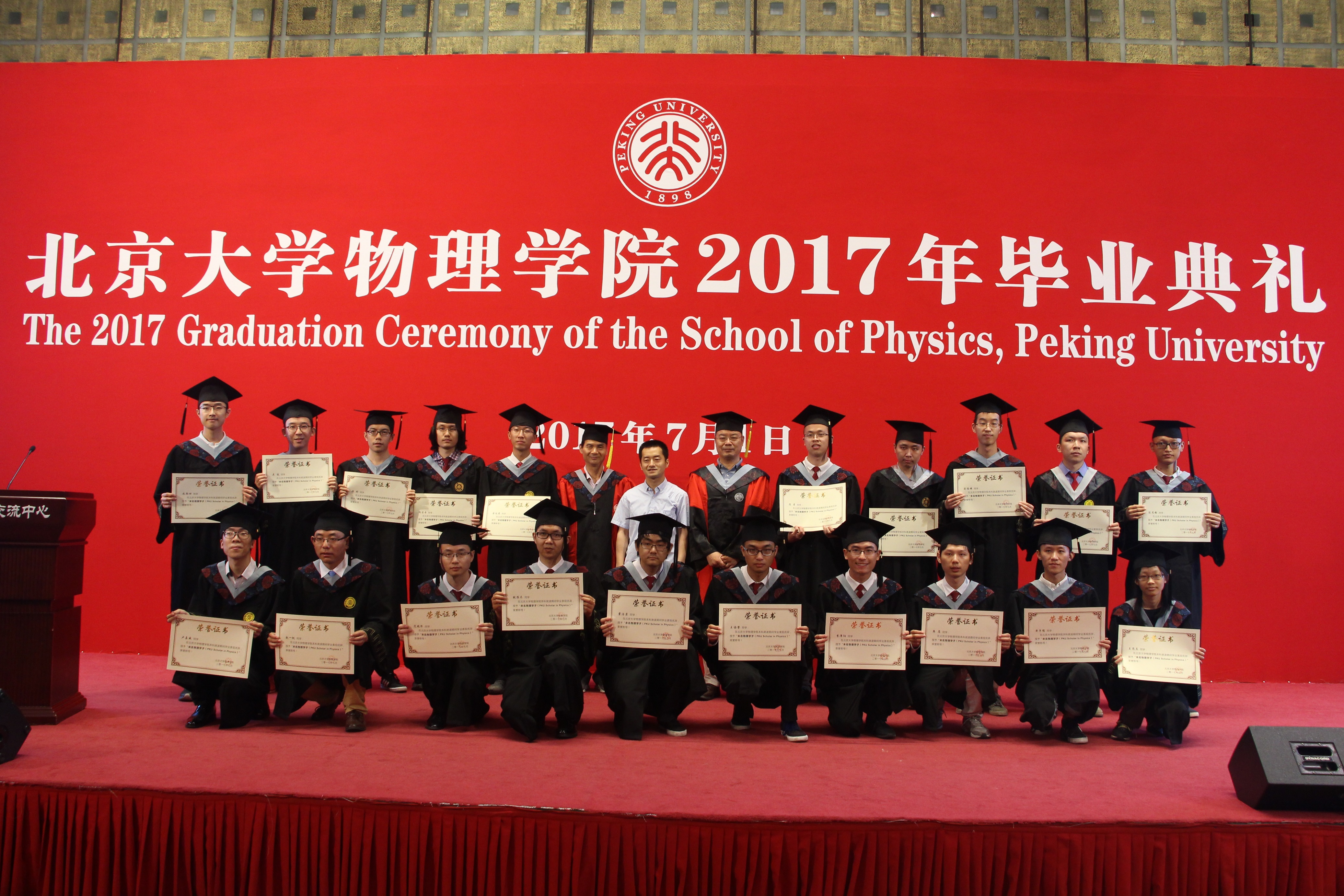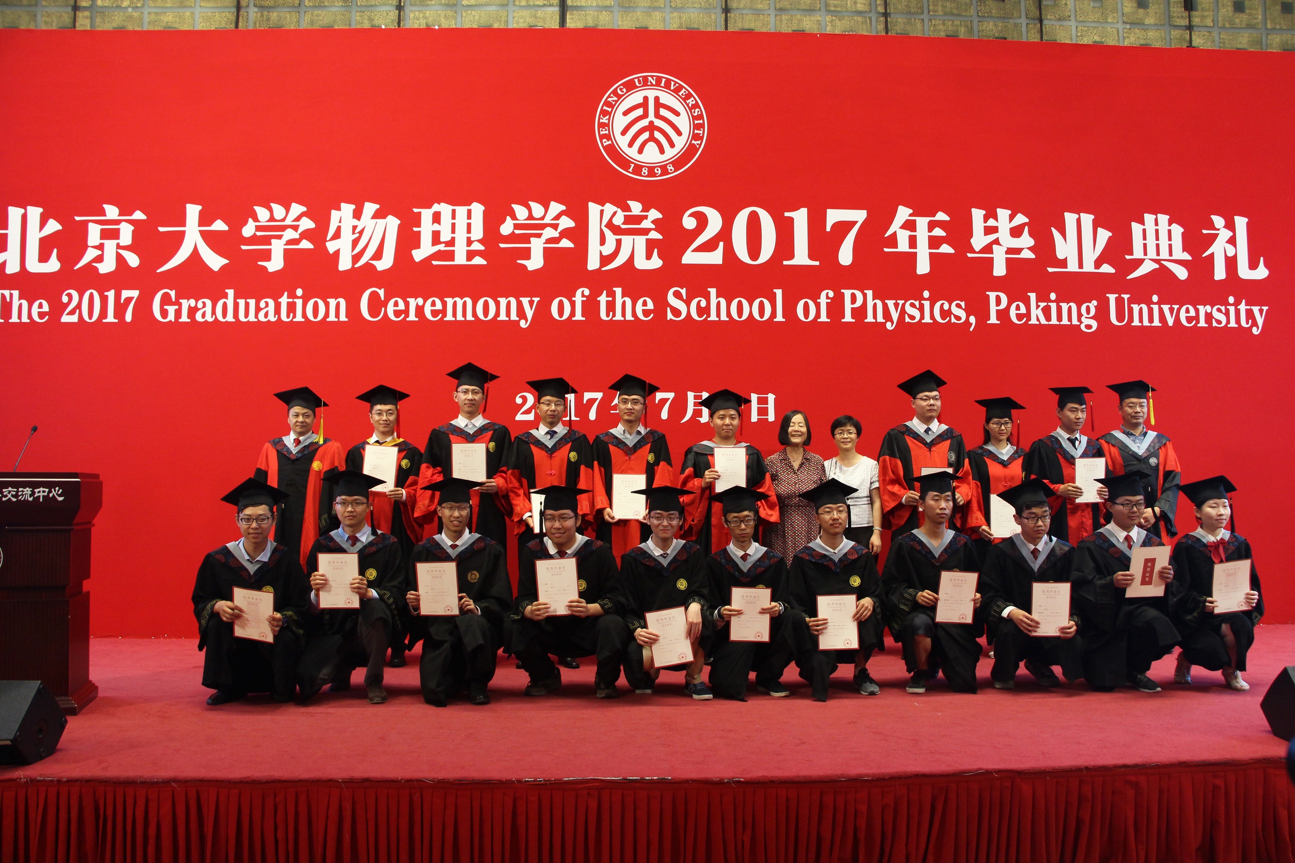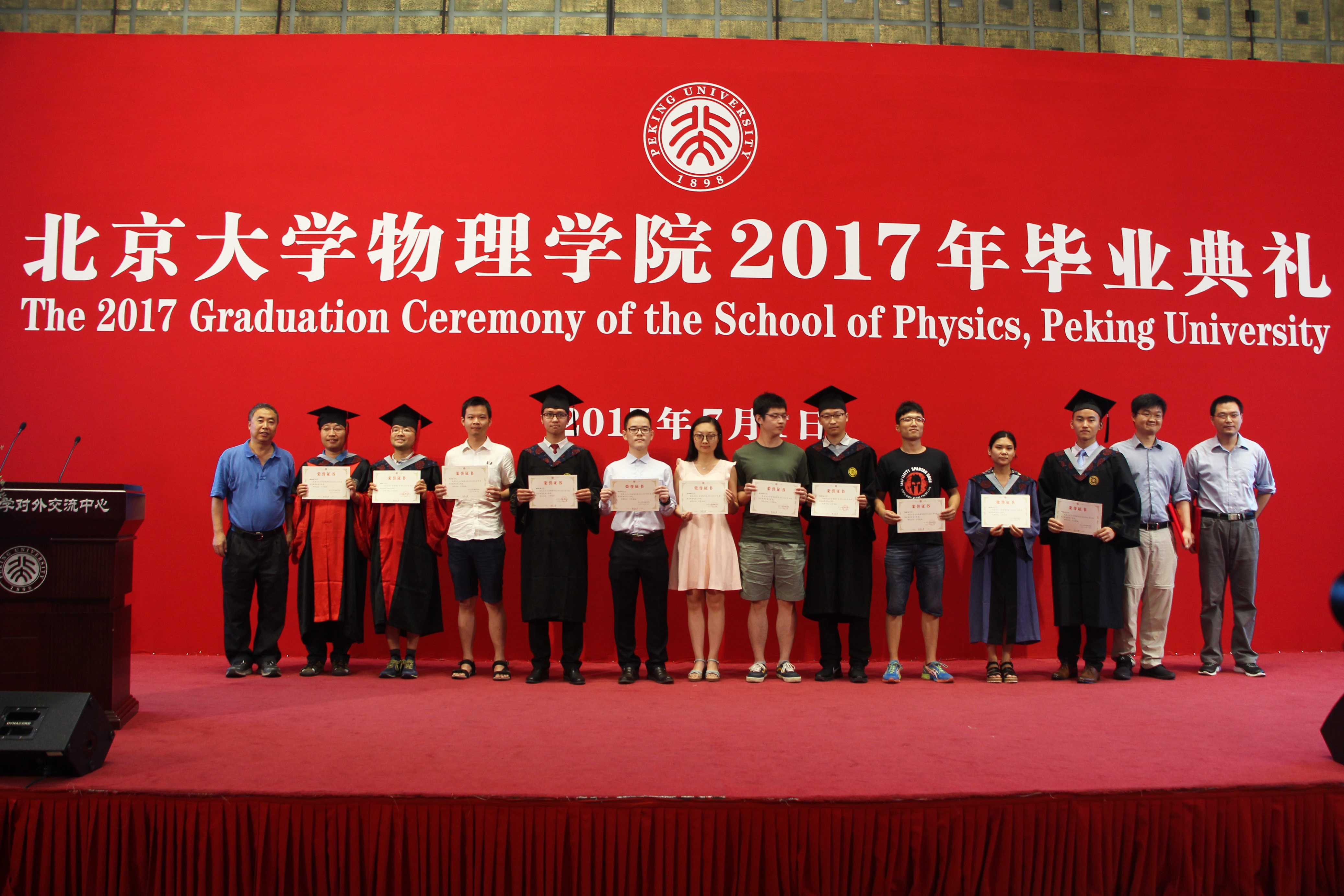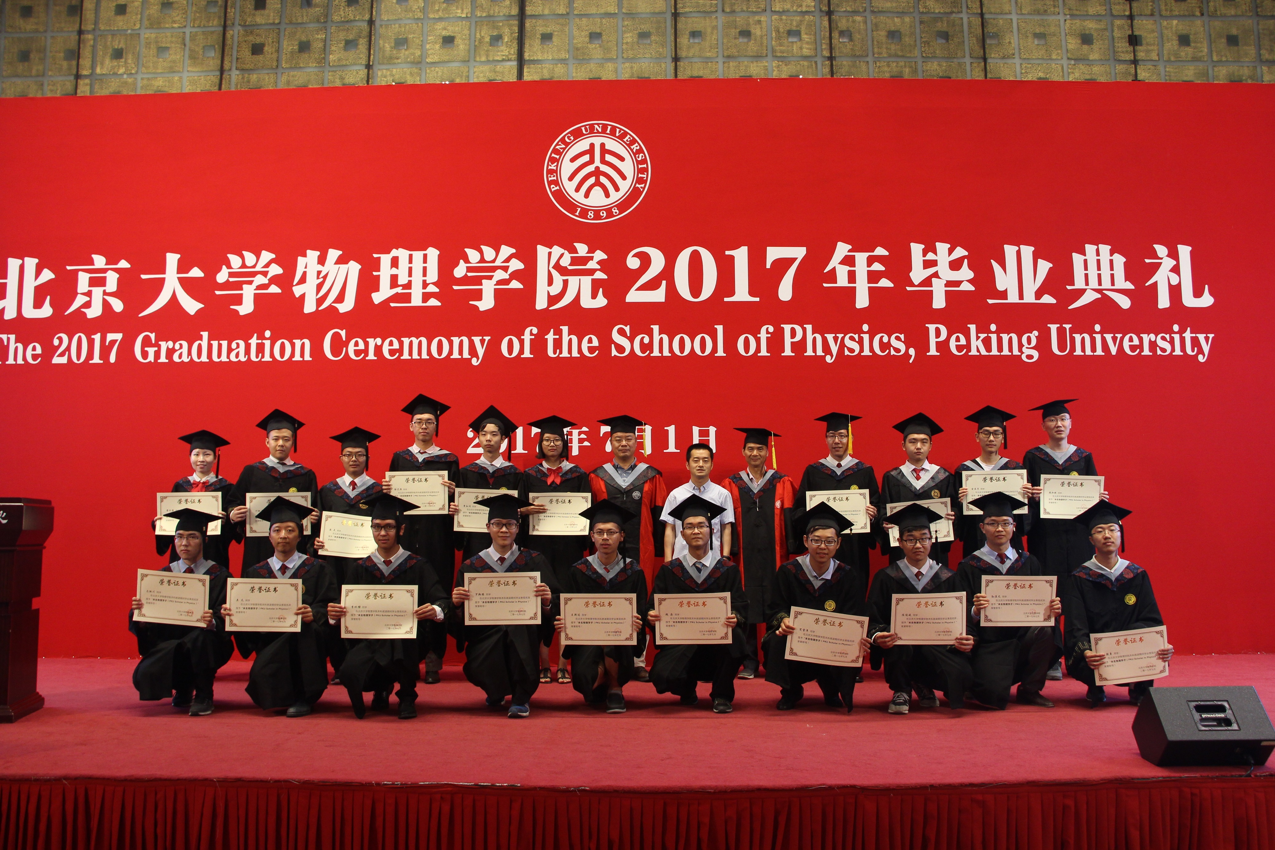 典礼的最后,由学院领导、教师代表和校友嘉宾为获得各荣誉奖项的毕业生颁奖。首先,77级校友代表牛谦教授为获得陈互雄奖教金、奖学金的师生颁奖并合影留念;接着,特邀嘉宾刘诞丽女士、欧冠官方网站党委书记陈晓林老师、副院长胡永云老师及党委副书记董晓华老师为获得“北京市优秀毕业生”荣誉称号的学生颁发证书,学院教师代表李新征、肖池阶、刘富坤、樊铁栓老师为获得“欧冠官方网站优秀毕业生”荣誉称号的学生颁发证书,胡永云、王垡、张朝晖三位老师为获得“未名物理学子”荣誉称号的学生颁发证书,谢心澄院长为“欧冠官方网站优秀博士论文”获得者颁奖。最后,由欧冠官方网站院长谢心澄院士与欧冠官方网站学位委员会物理分会主席、欧冠官方网站副院长王宇钢教授分别为本科毕业生和研究生毕业生一一颁发毕业证书、拨穗并合影留念。