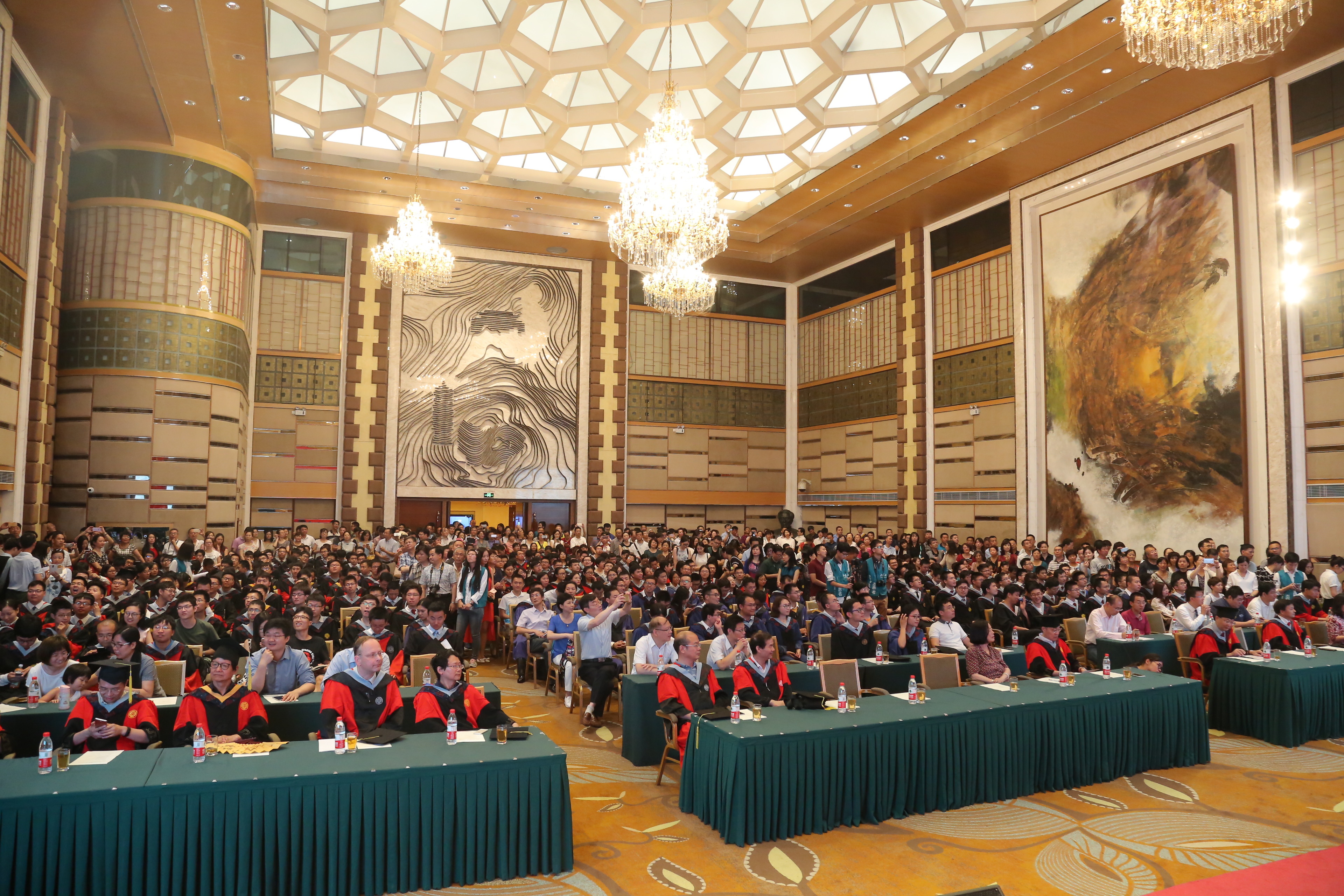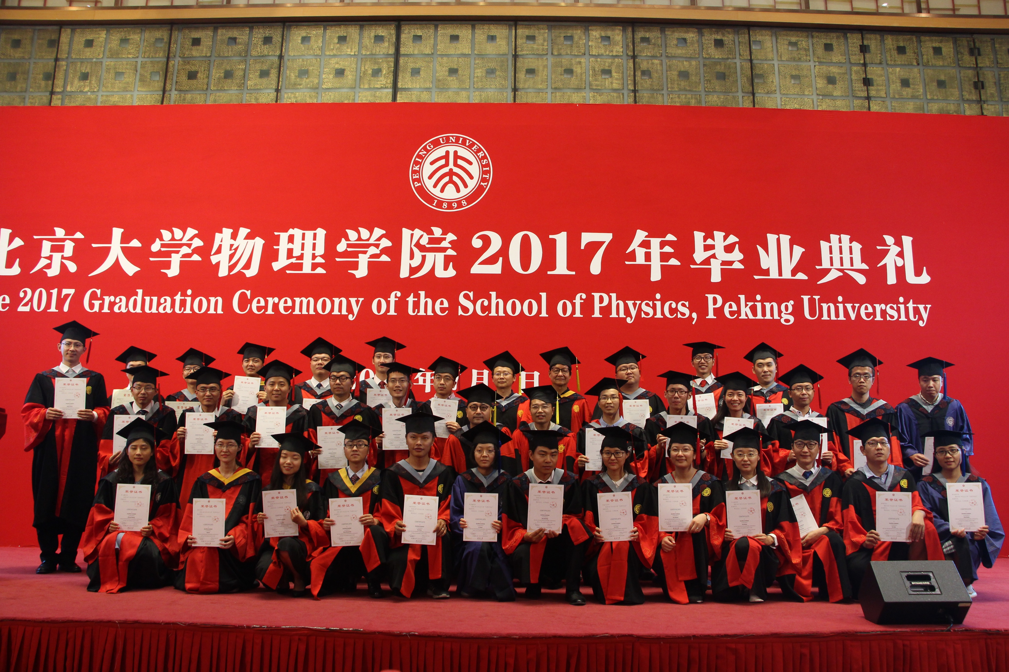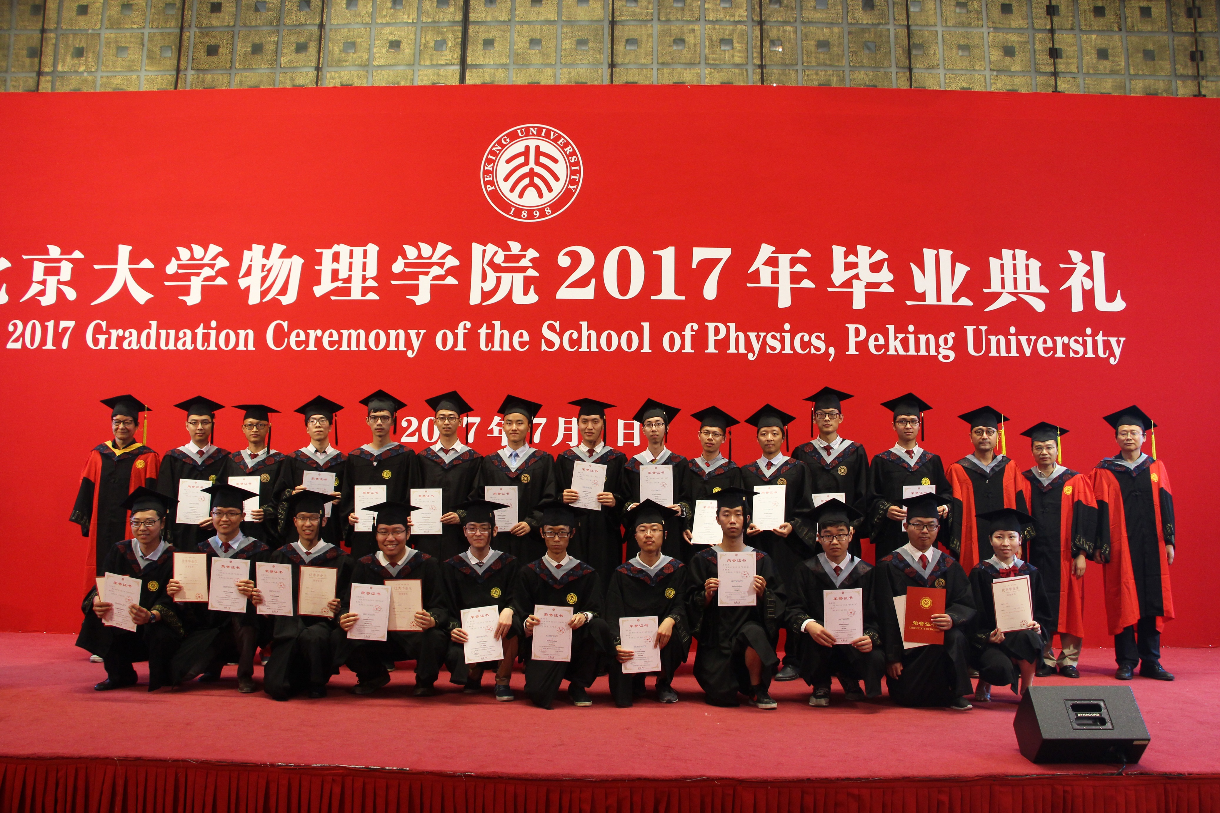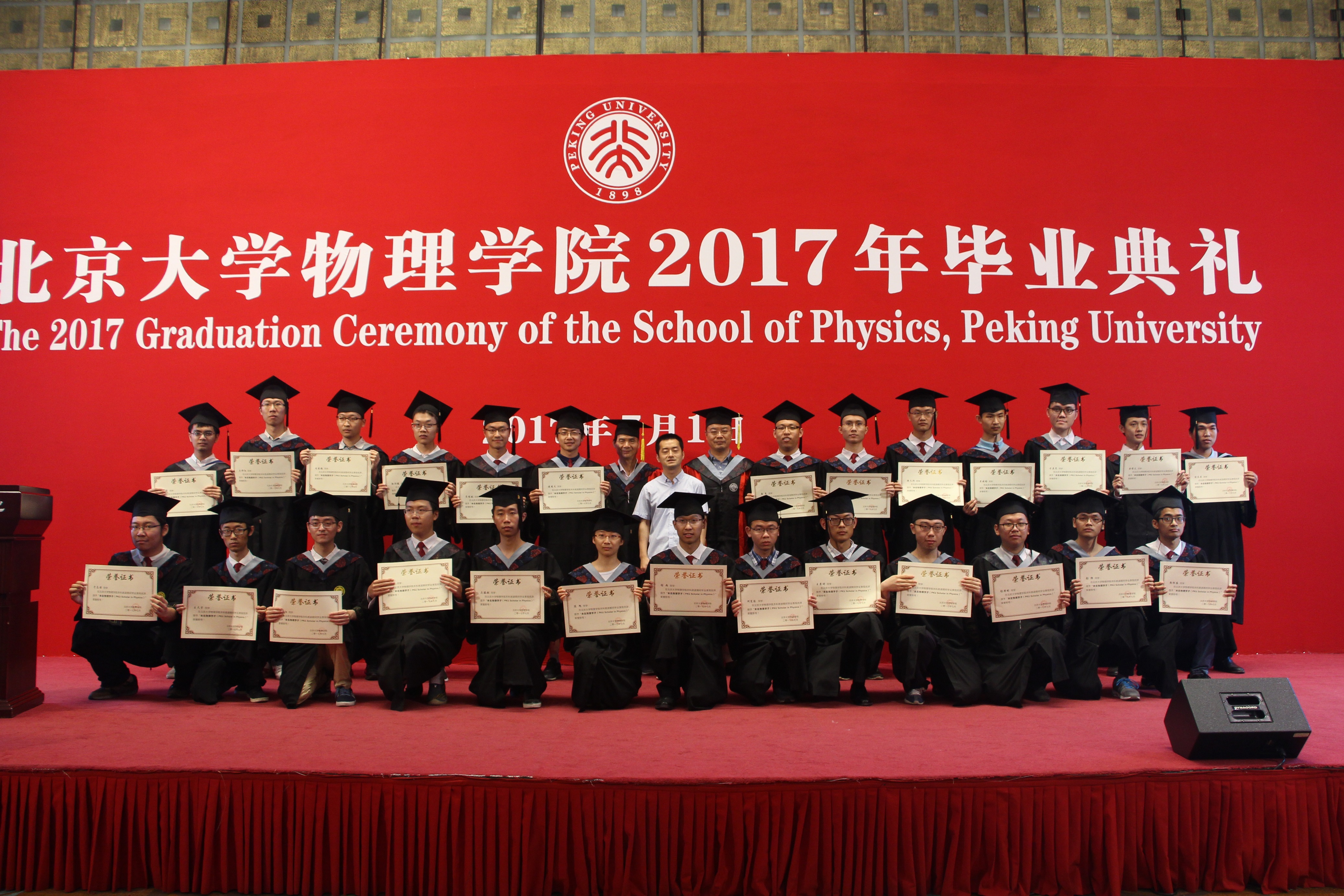 典礼的最后,由学院领导、教师代表和校友嘉宾为获得各荣誉奖项的毕业生颁奖。首先,77级校友代表牛谦教授为获得陈互雄奖教金、奖学金的师生颁奖并合影留念;接着,特邀嘉宾刘诞丽女士、欧冠官方网站党委书记陈晓林老师、副院长胡永云老师及党委副书记董晓华老师为获得“北京市优秀毕业生”荣誉称号的学生颁发证书,学院教师代表李新征、肖池阶、刘富坤、樊铁栓老师为获得“欧冠官方网站优秀毕业生”荣誉称号的学生颁发证书,胡永云、王垡、张朝晖三位老师为获得“未名物理学子”荣誉称号的学生颁发证书,谢心澄院长为“欧冠官方网站优秀博士论文”获得者颁奖。最后,由欧冠官方网站院长谢心澄院士与欧冠官方网站学位委员会物理分会主席、欧冠官方网站副院长王宇钢教授分别为本科毕业生和研究生毕业生一一颁发毕业证书、拨穗并合影留念。