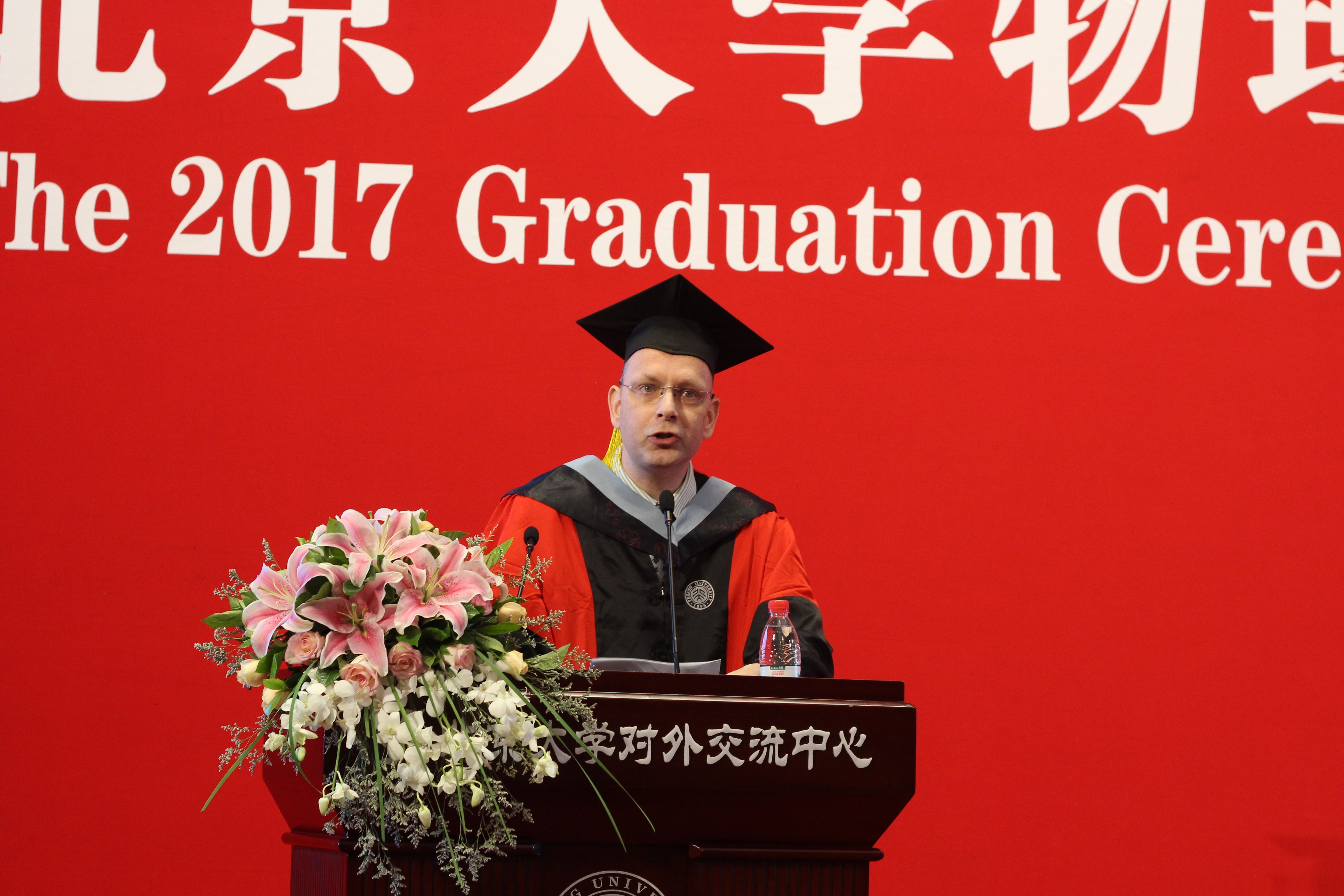 之后,科维理天文与天体物理研究所教授何锐思(Richard de Grijs)作为导师代表发言。他与全体毕业生分享了自己从本科期间的荷兰格罗宁根大学到今天在北大任职的经历,向同学们诉说这期间的喜悦与汗水、机遇与挑战,并以此鼓励同学们面对广阔的世界时应走出属于自己的独一无二的人生路。