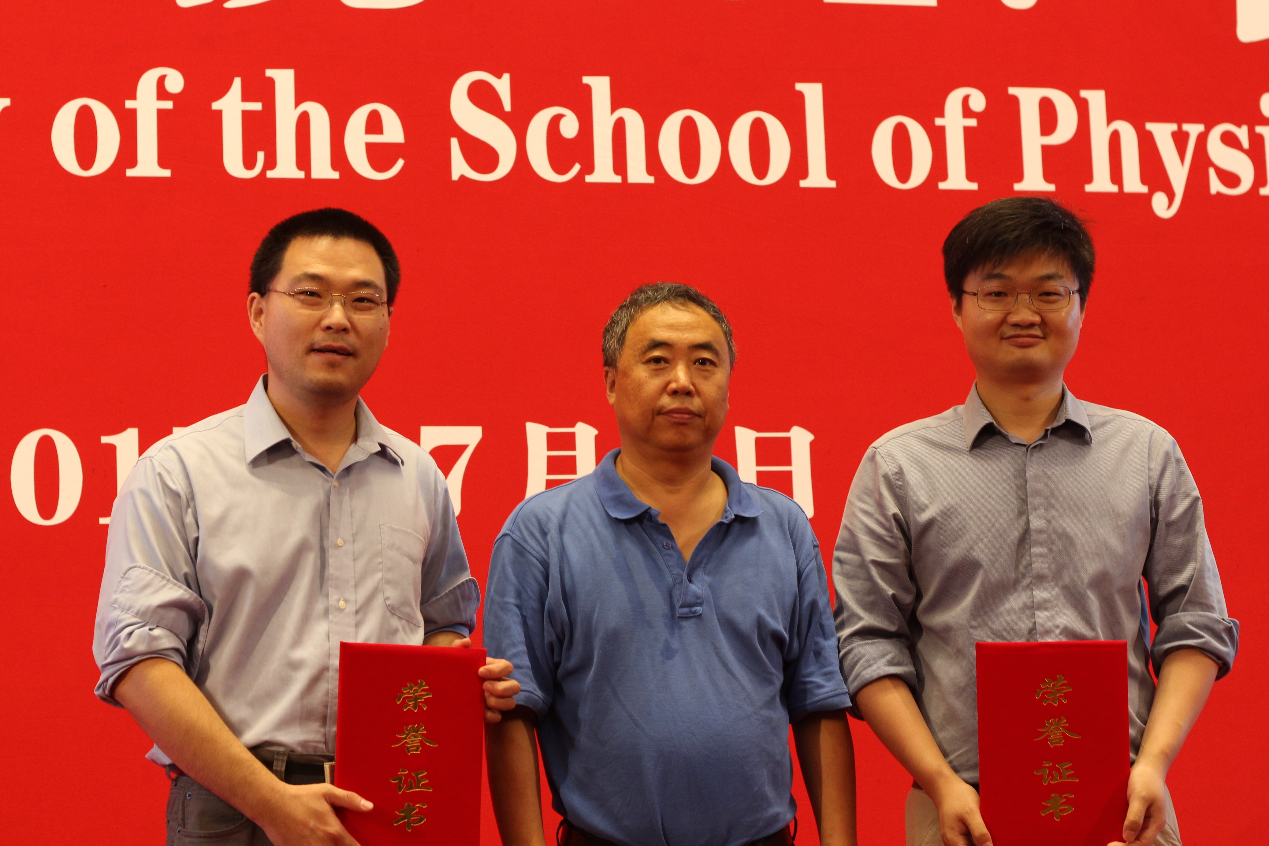 胡永云、王垡、张朝晖老师为获得“未名物理学子”荣誉称号的学生颁发证书并合影留念 |