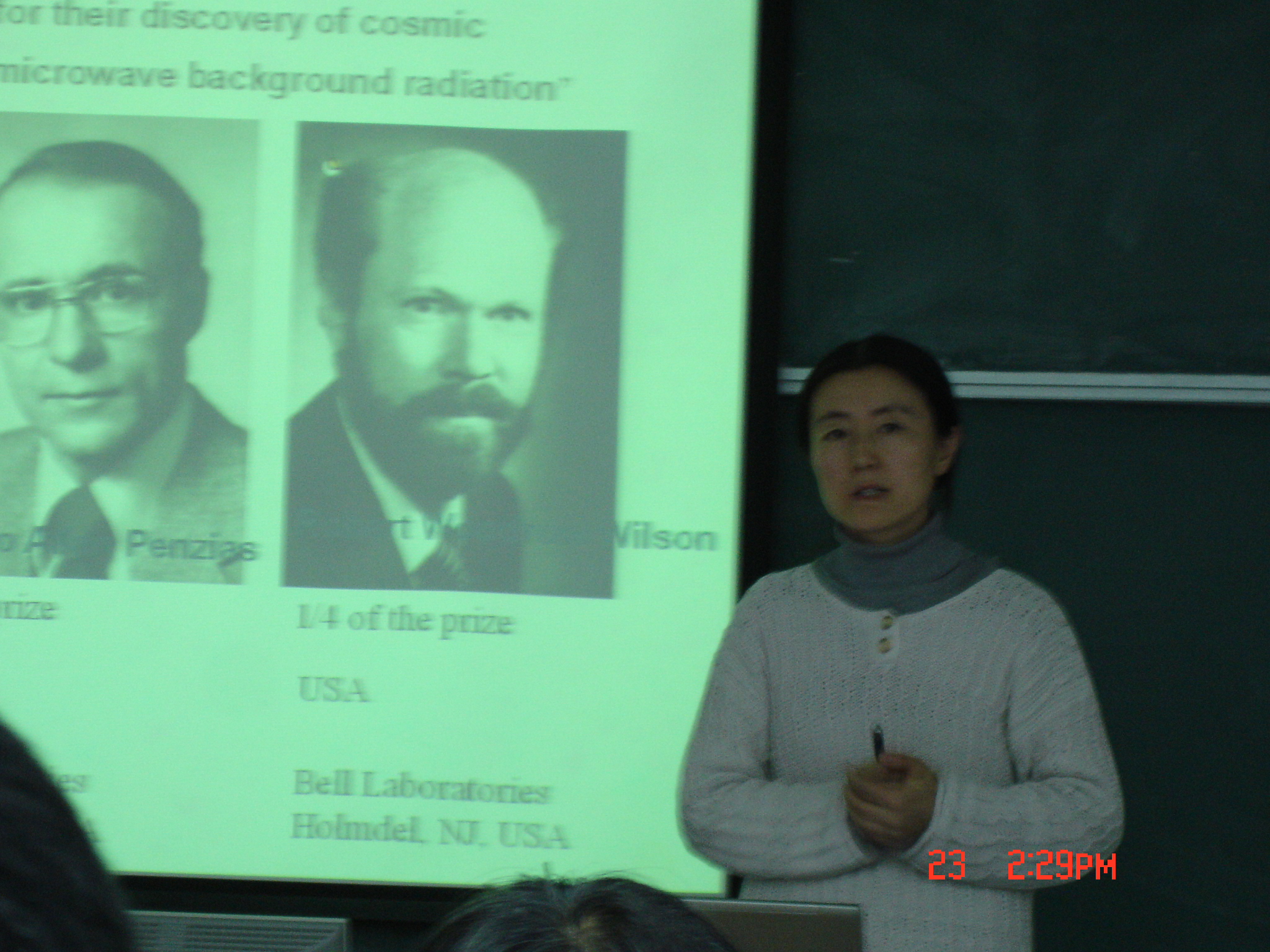 范祖辉教授首先介绍了2006年的诺贝尔物理学奖。该奖颁给了美国物理学家John C. Mather 和 George F. Smoot,因为他们利用COBE卫星详细测定了宇宙微波背景辐射的黑体谱并证实了背景辐射是各向异性的,这成为宇宙大爆炸学说的强有力的支持,同时他们的工作也成了精确宇宙学的开端。事实上,这不是第一次因为背景辐射而颁发诺贝尔物理学奖,早在1978年,Penzias
