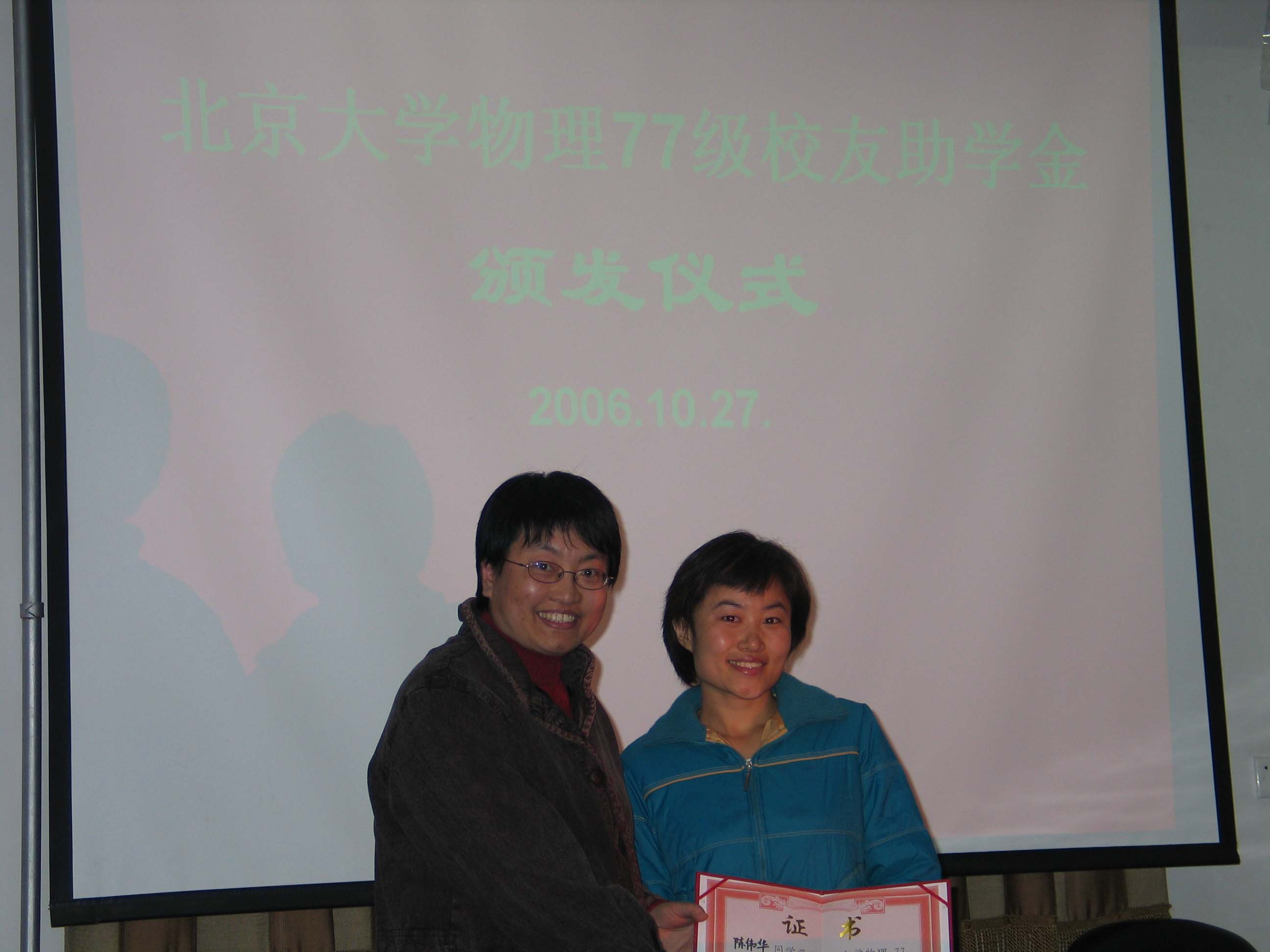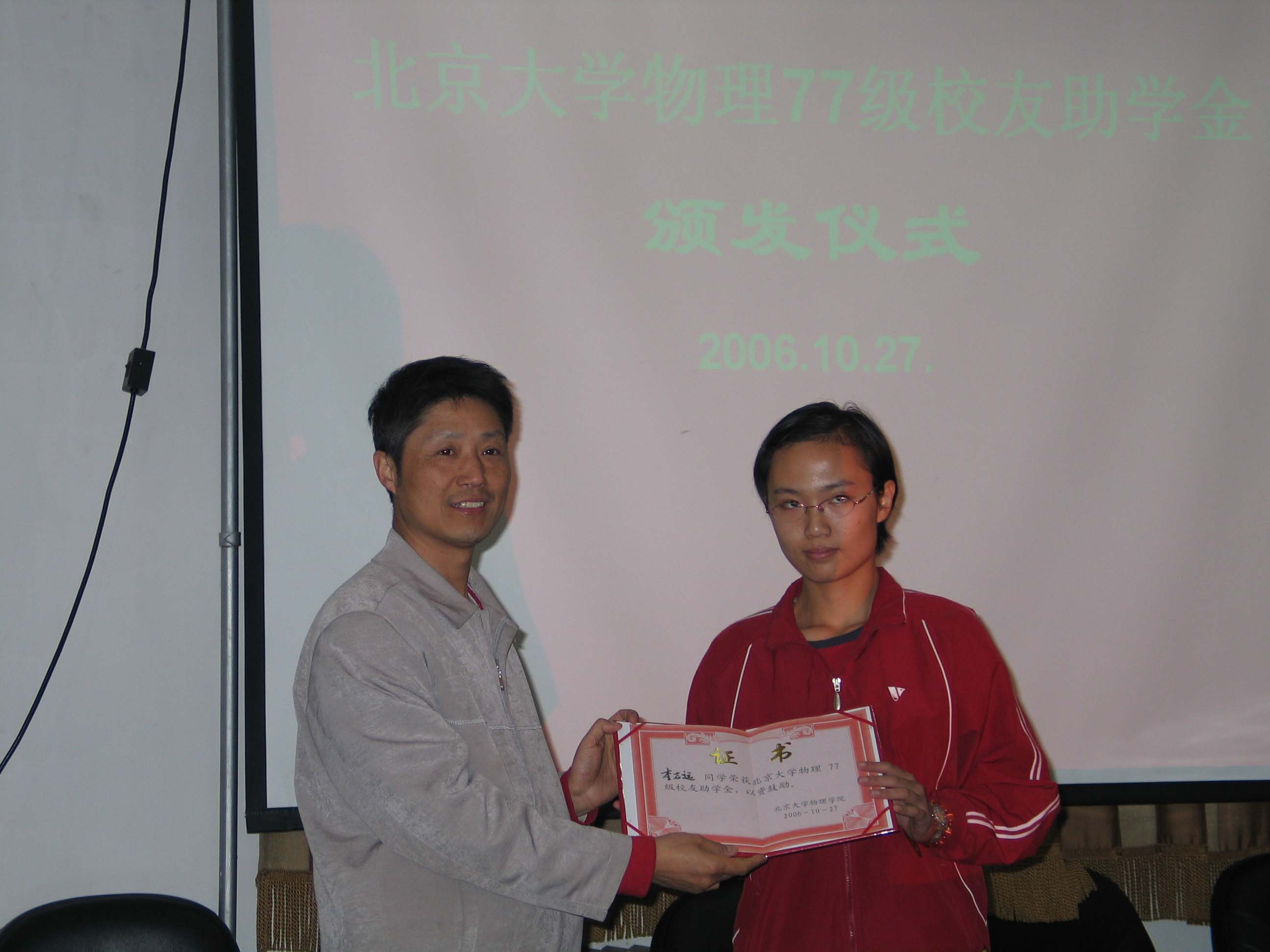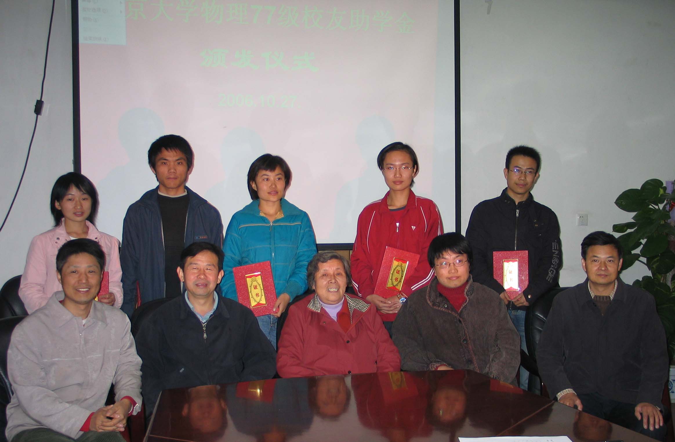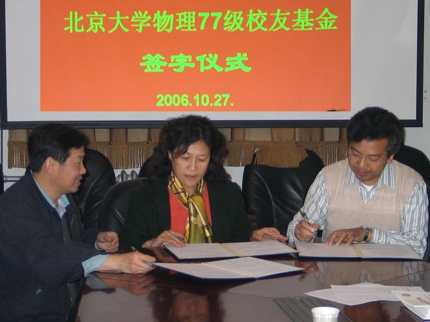 欧冠官方网站物理77级校友基金协议签字仪式和欧冠官方网站物理77级校友助学金颁发仪式于2006年10月27日在欧冠官方网站举行。欧冠官方网站物理77级校友代表,欧冠官方网站教育基金会和欧冠官方网站的有关领导出席并在协议上签字。黄畇教授、王稼军教授和其他师生也参加了仪式。