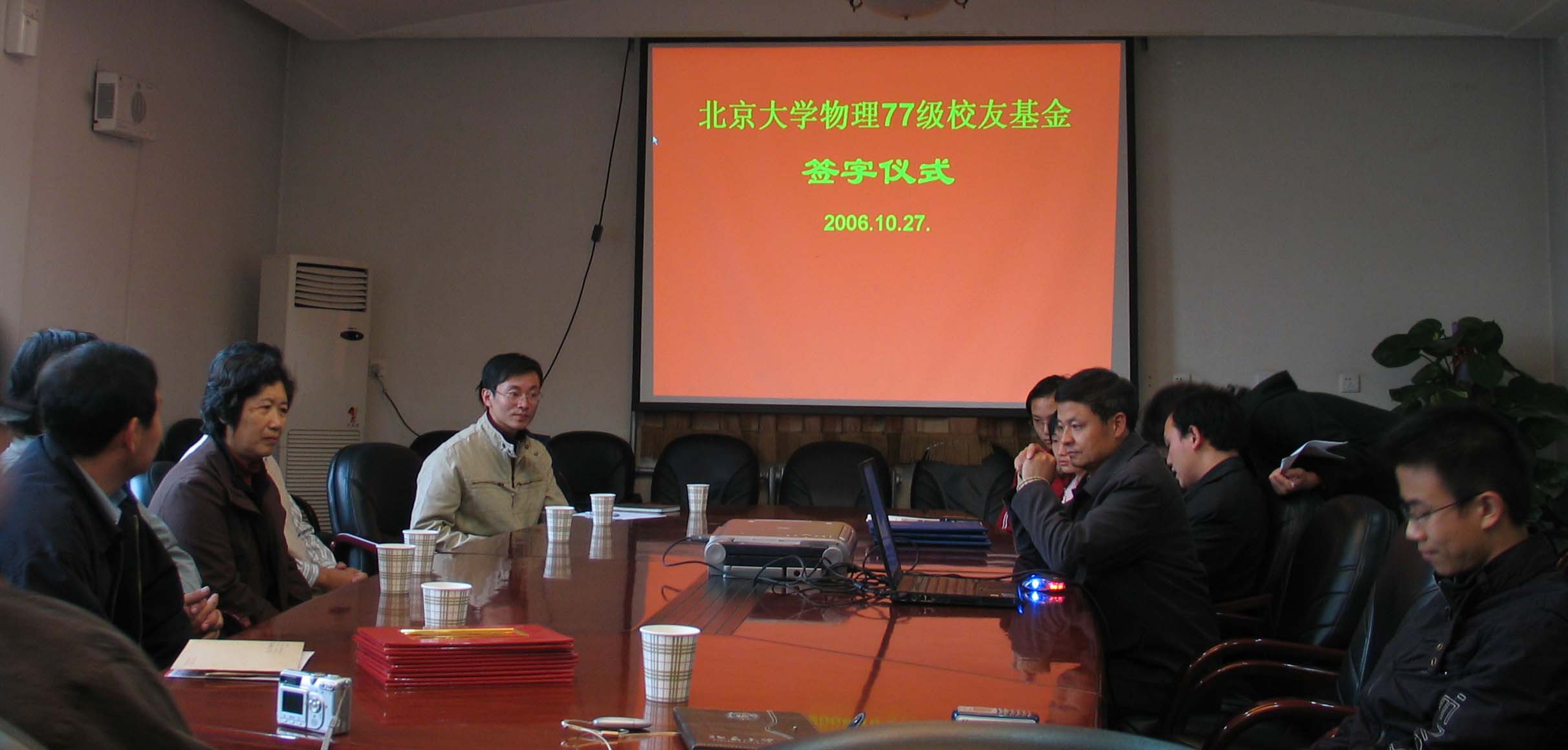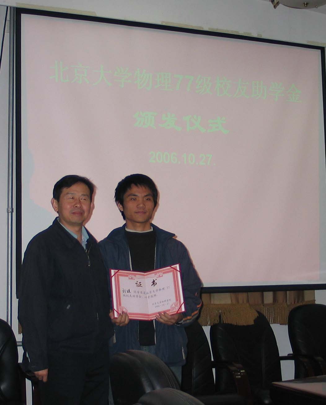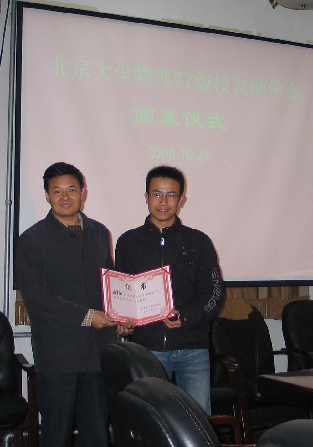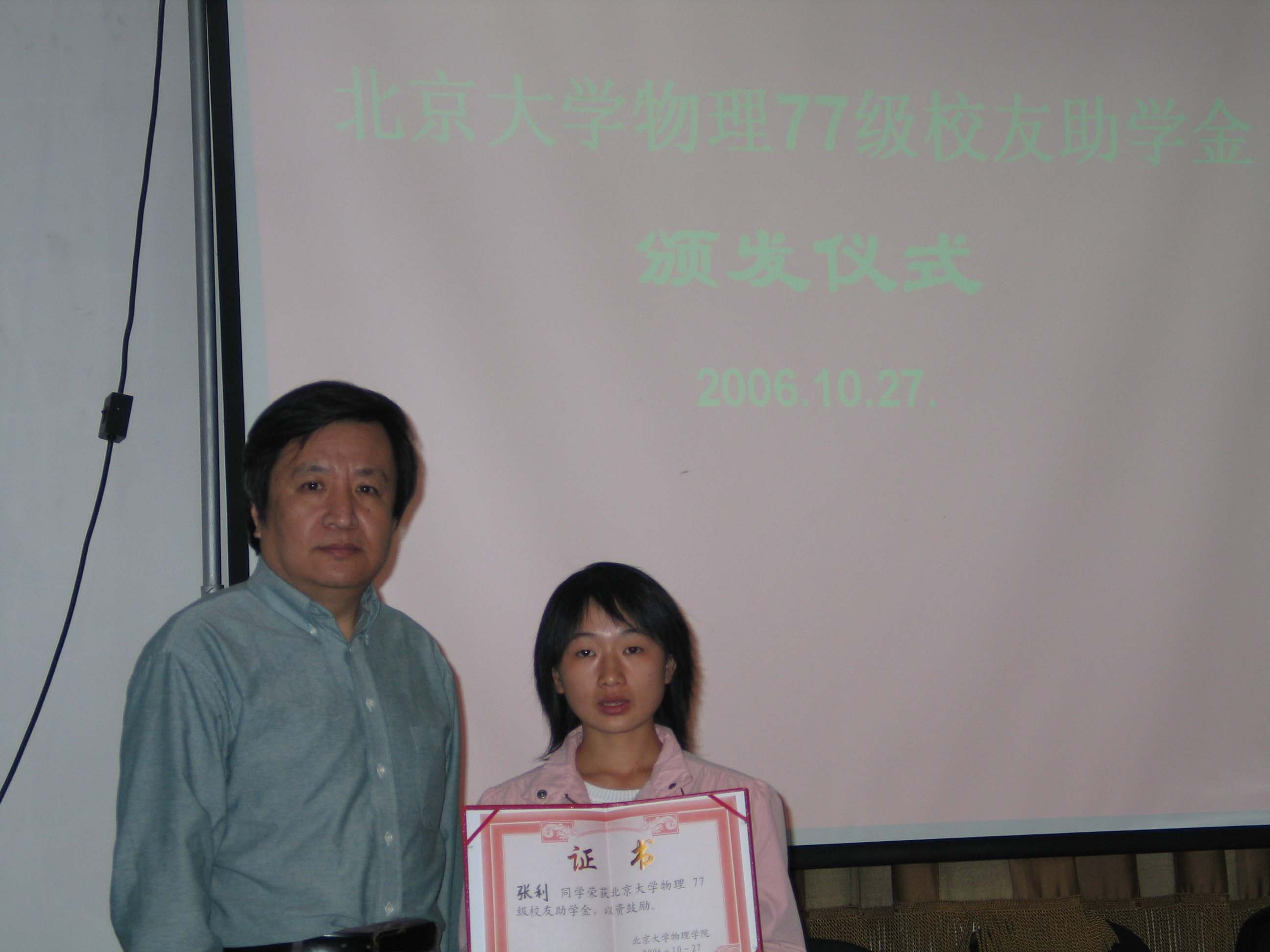 欧冠官方网站物理77级校友基金协议签字仪式和欧冠官方网站物理77级校友助学金颁发仪式于2006年10月27日在欧冠官方网站举行。欧冠官方网站物理77级校友代表,欧冠官方网站教育基金会和欧冠官方网站的有关领导出席并在协议上签字。黄畇教授、王稼军教授和其他师生也参加了仪式。
