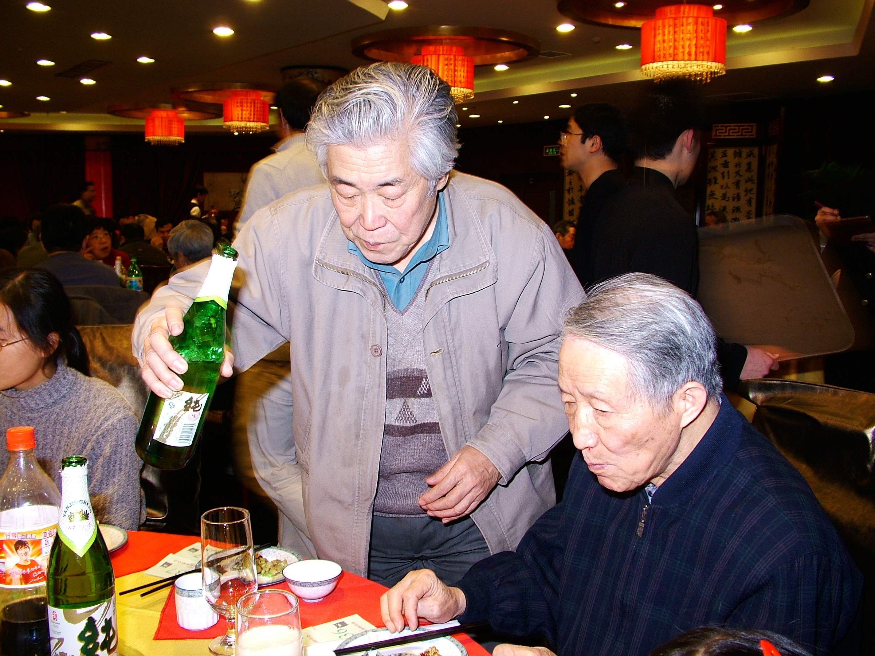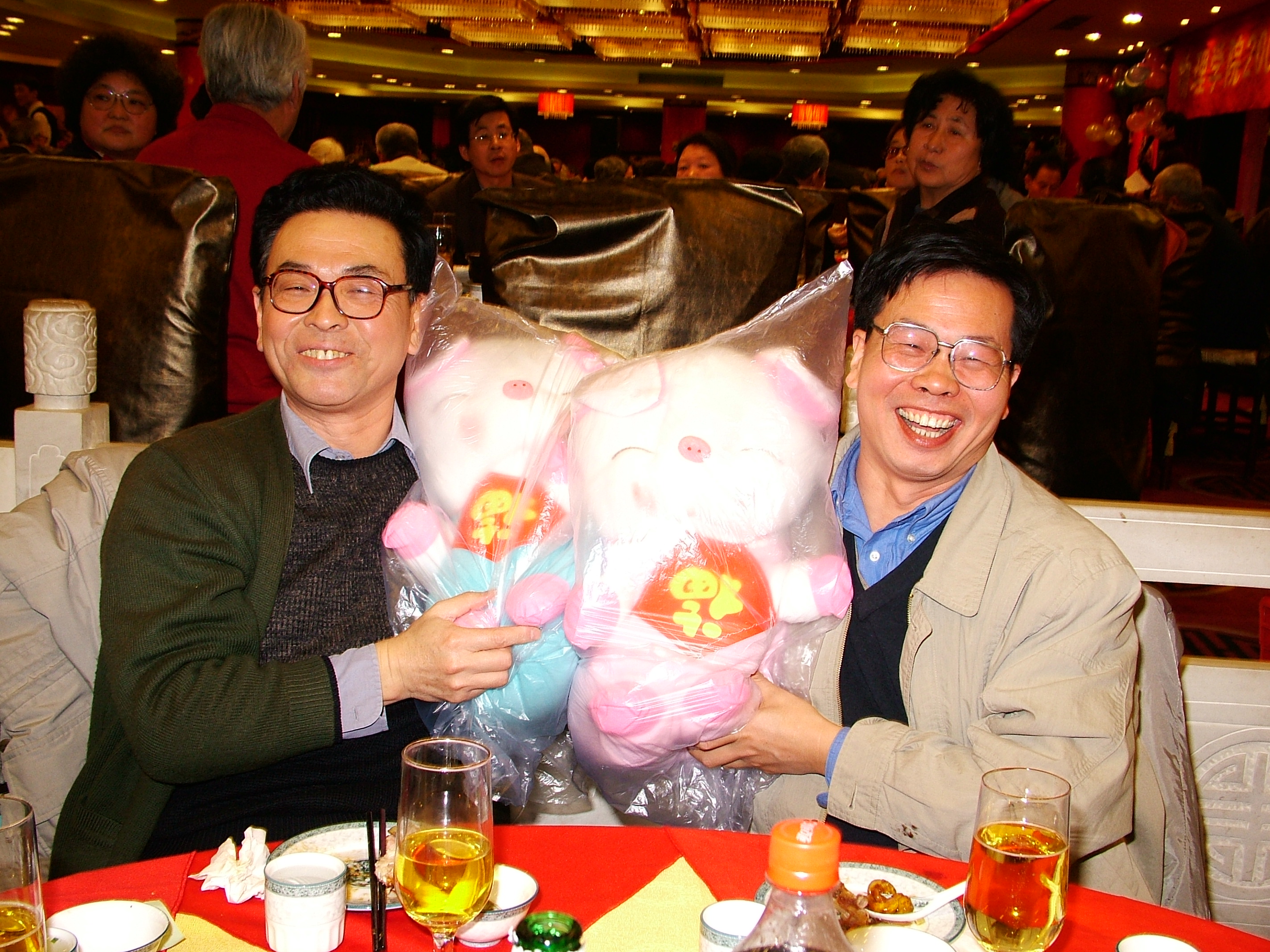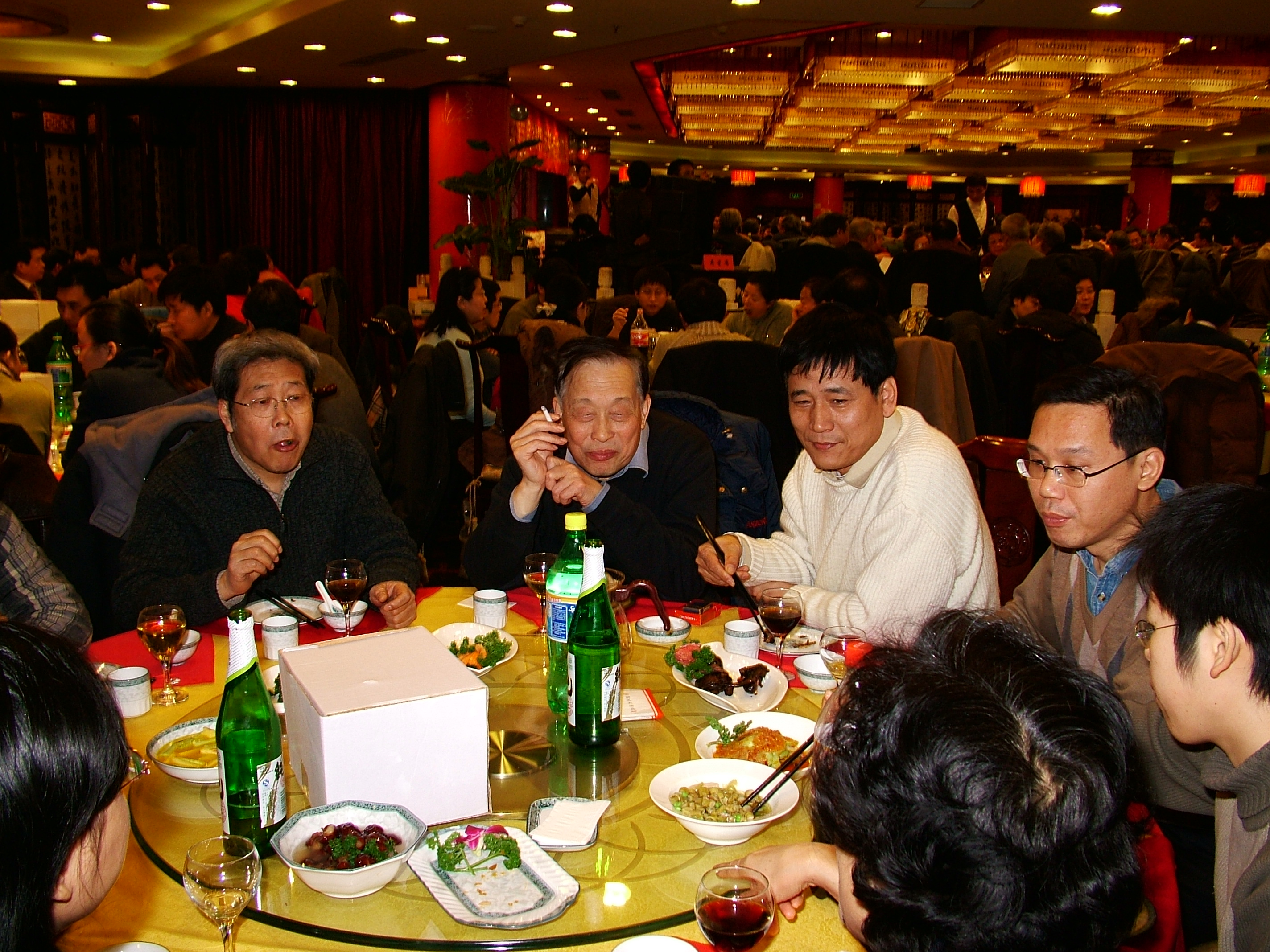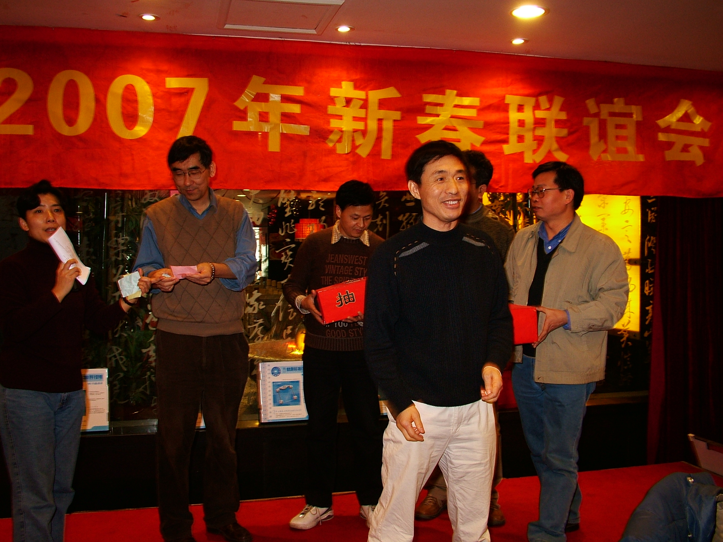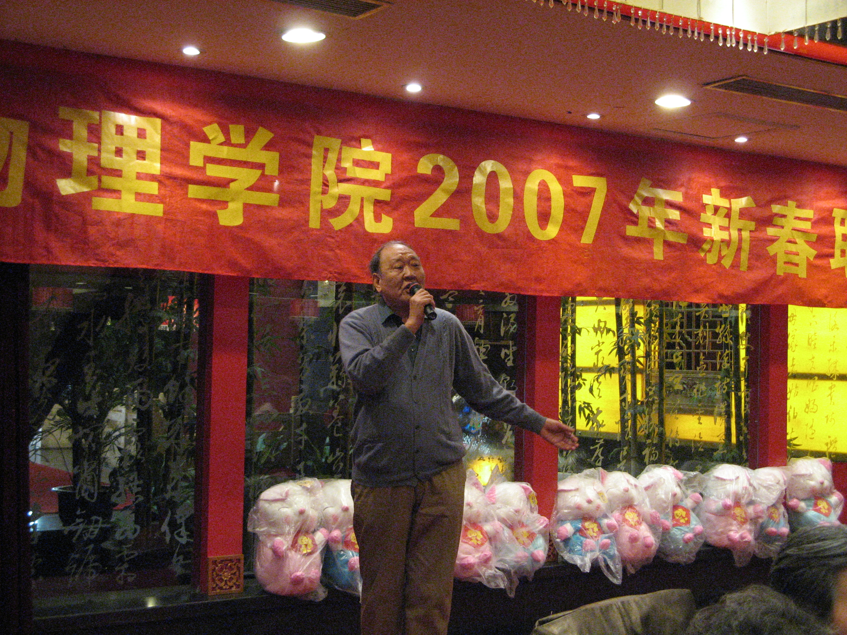 开始自由表演,大家一边品尝美味佳肴,一边自娱自乐。本是上海人的叶学敏教授兴致勃勃地唱了一段京剧“甘洒热血写春秋”,虽然,说不上字正腔圆,却也韵味十足;技物系孟杰教授没忘老传统,上台后先给大家拜了个早年,又献上了一首“花儿为什么这样红”着实勇气可嘉;最后蹦上台的是金猪本命年的俞大鹏教授,他演绎的经典歌曲“牧歌”,虽是耳熟能详,却很是让大家回忆逝去的光阴,歌唱毕,他的同桌给他献上一朵红玫瑰以资鼓励他精彩的才艺展示,这种别具一格又带点幽默感的和谐之美,立即得到周边各位的认同,大家都报以热烈的掌声。