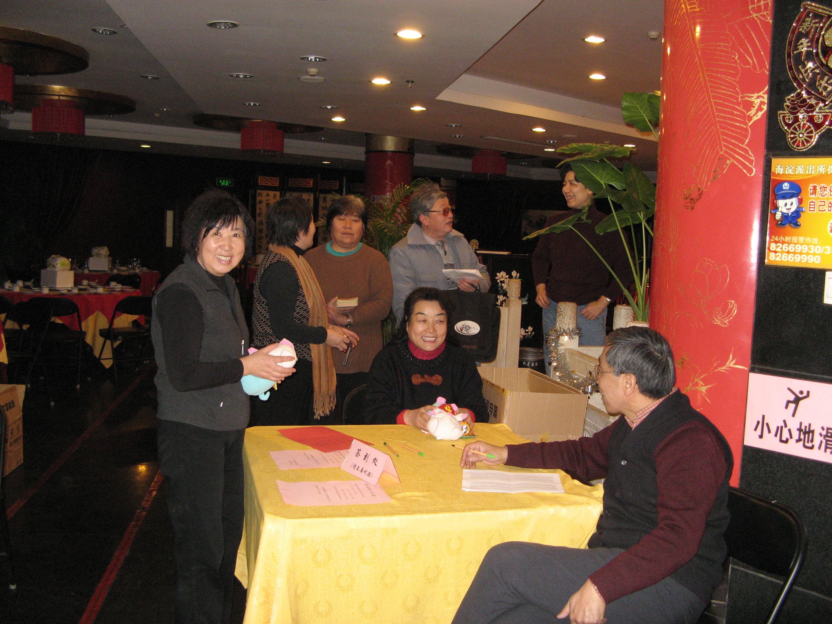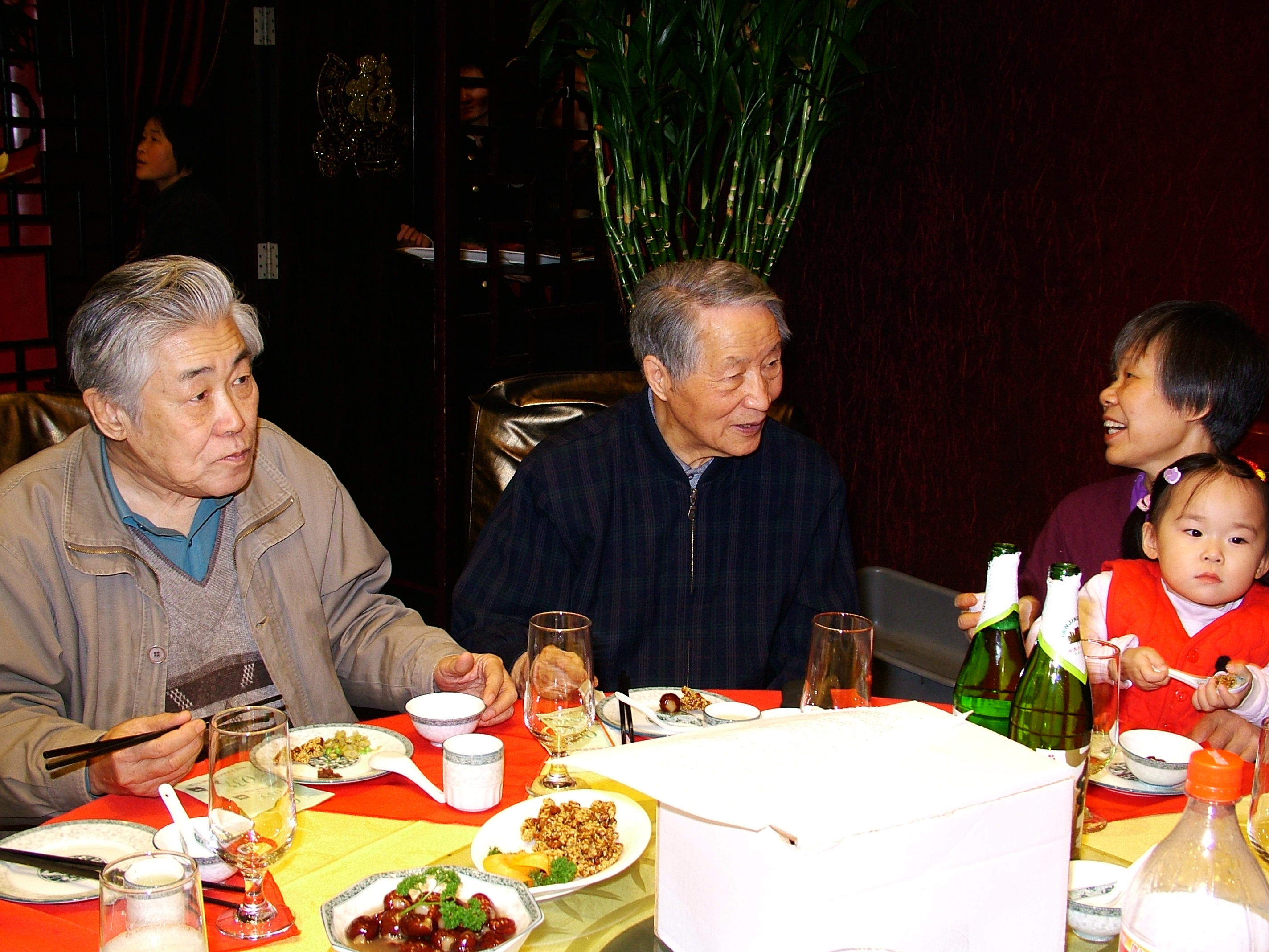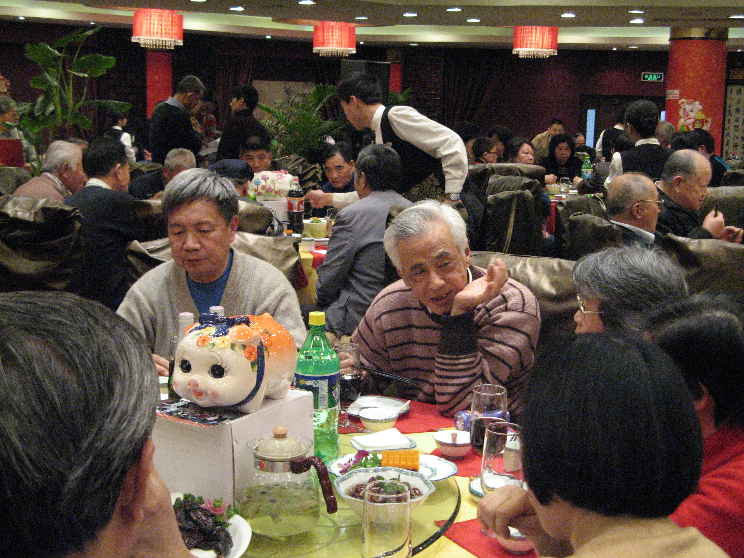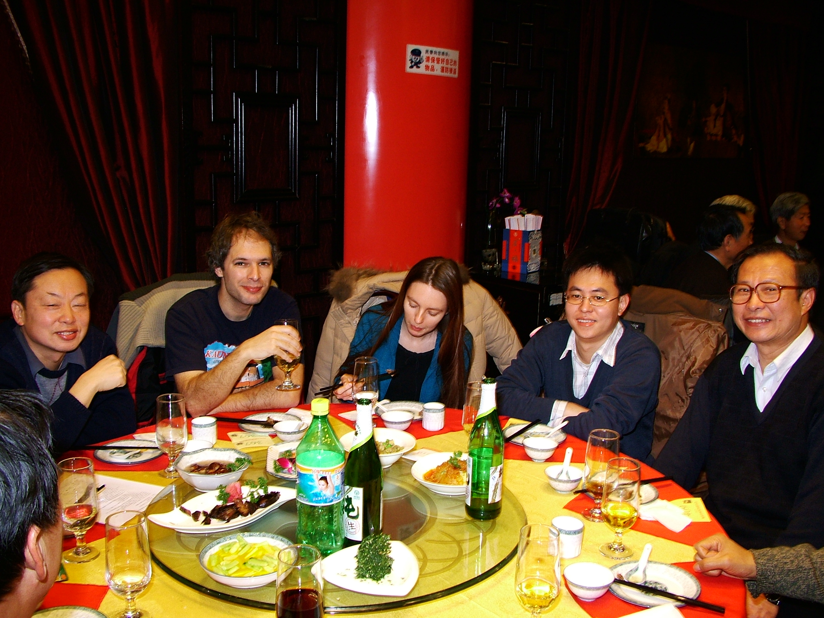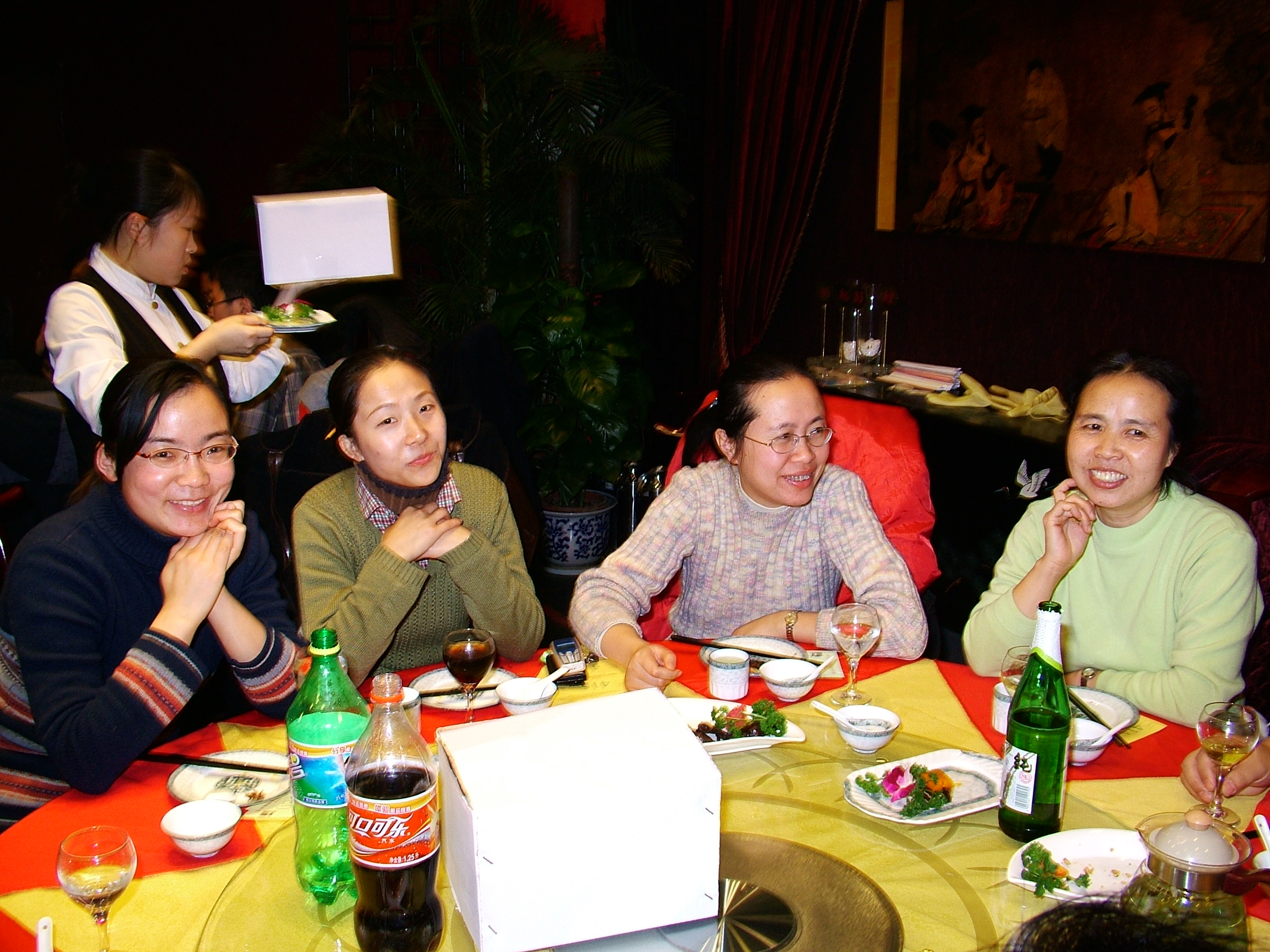 开始自由表演,大家一边品尝美味佳肴,一边自娱自乐。本是上海人的叶学敏教授兴致勃勃地唱了一段京剧“甘洒热血写春秋”,虽然,说不上字正腔圆,却也韵味十足;技物系孟杰教授没忘老传统,上台后先给大家拜了个早年,又献上了一首“花儿为什么这样红”着实勇气可嘉;最后蹦上台的是金猪本命年的俞大鹏教授,他演绎的经典歌曲“牧歌”,虽是耳熟能详,却很是让大家回忆逝去的光阴,歌唱毕,他的同桌给他献上一朵红玫瑰以资鼓励他精彩的才艺展示,这种别具一格又带点幽默感的和谐之美,立即得到周边各位的认同,大家都报以热烈的掌声。