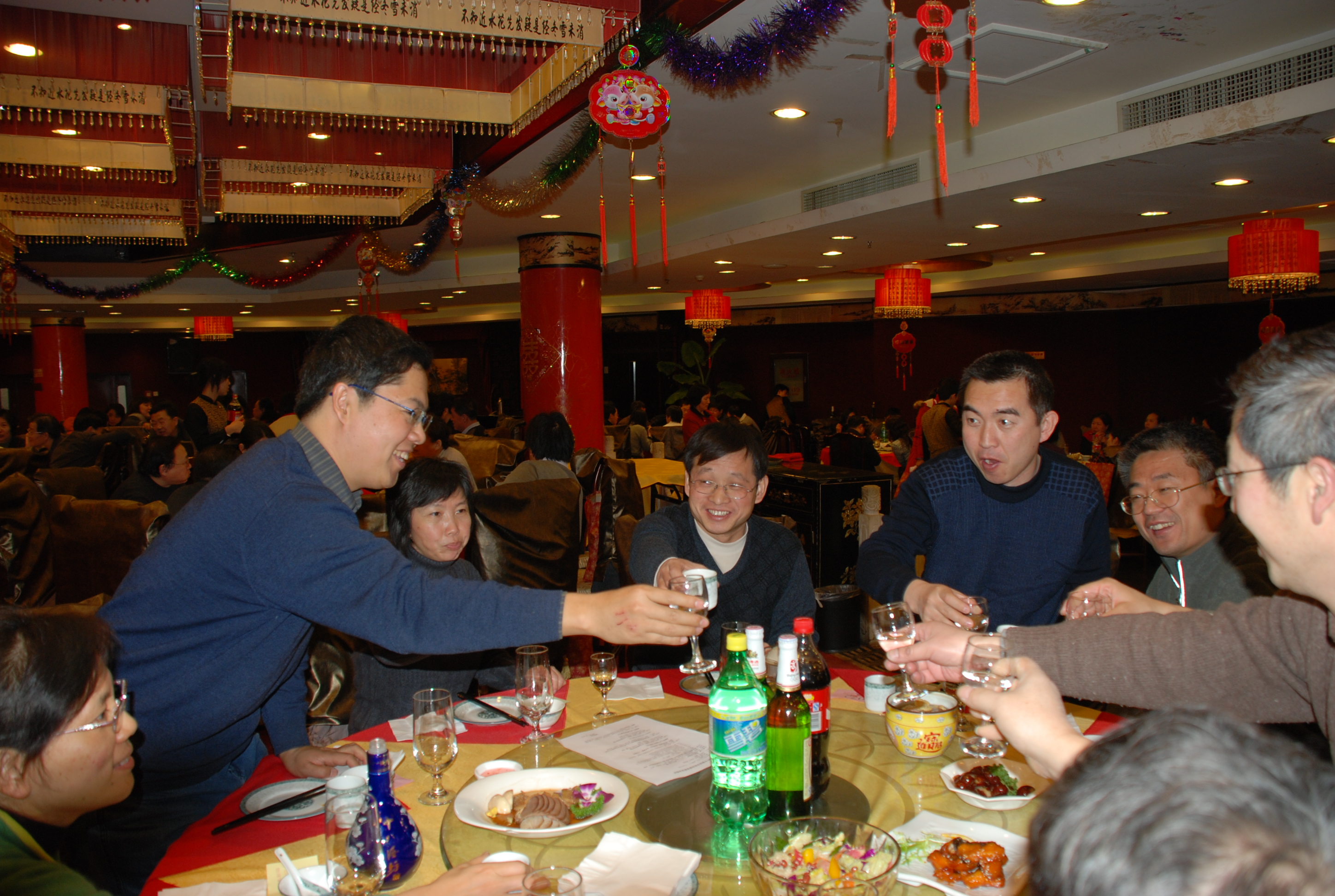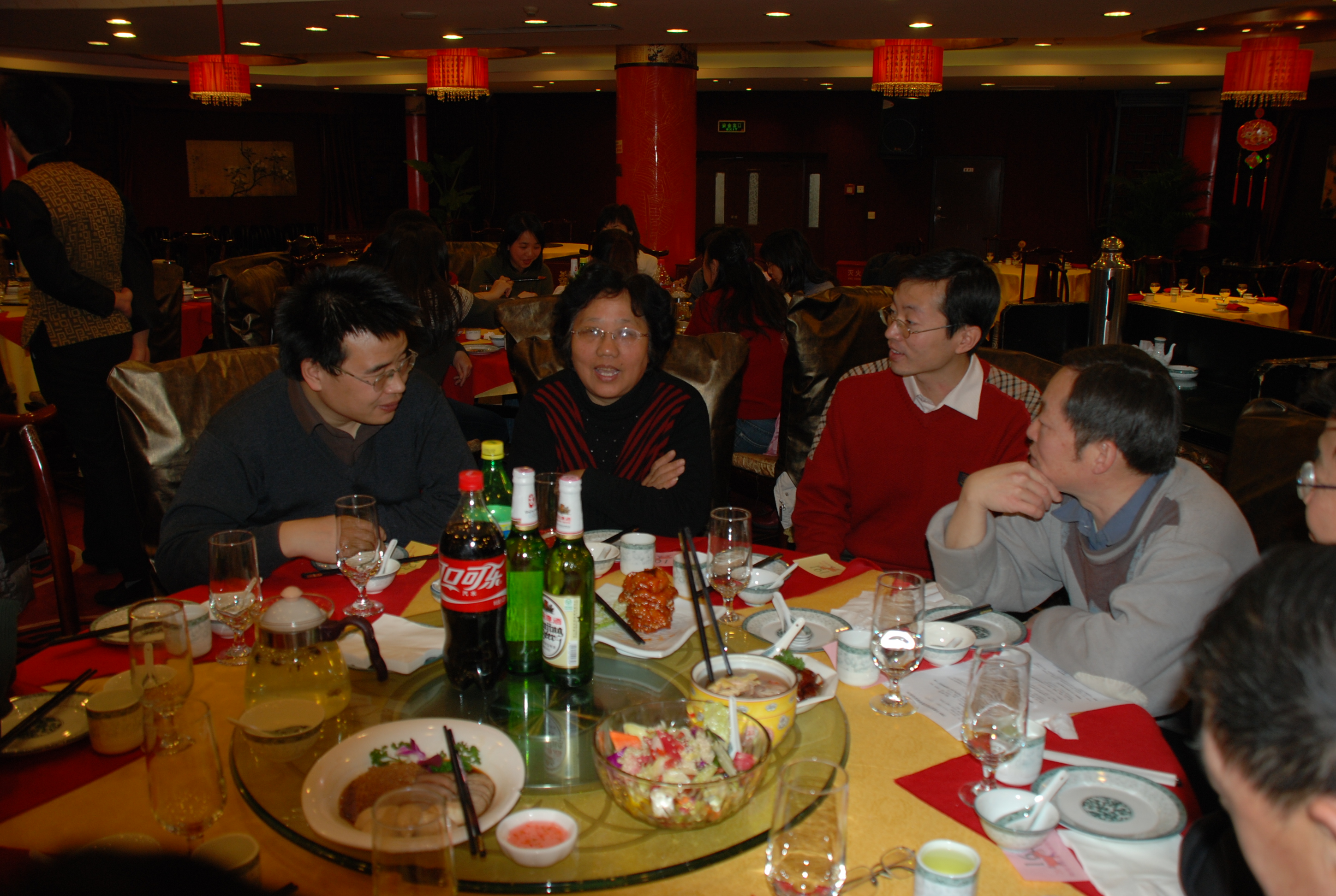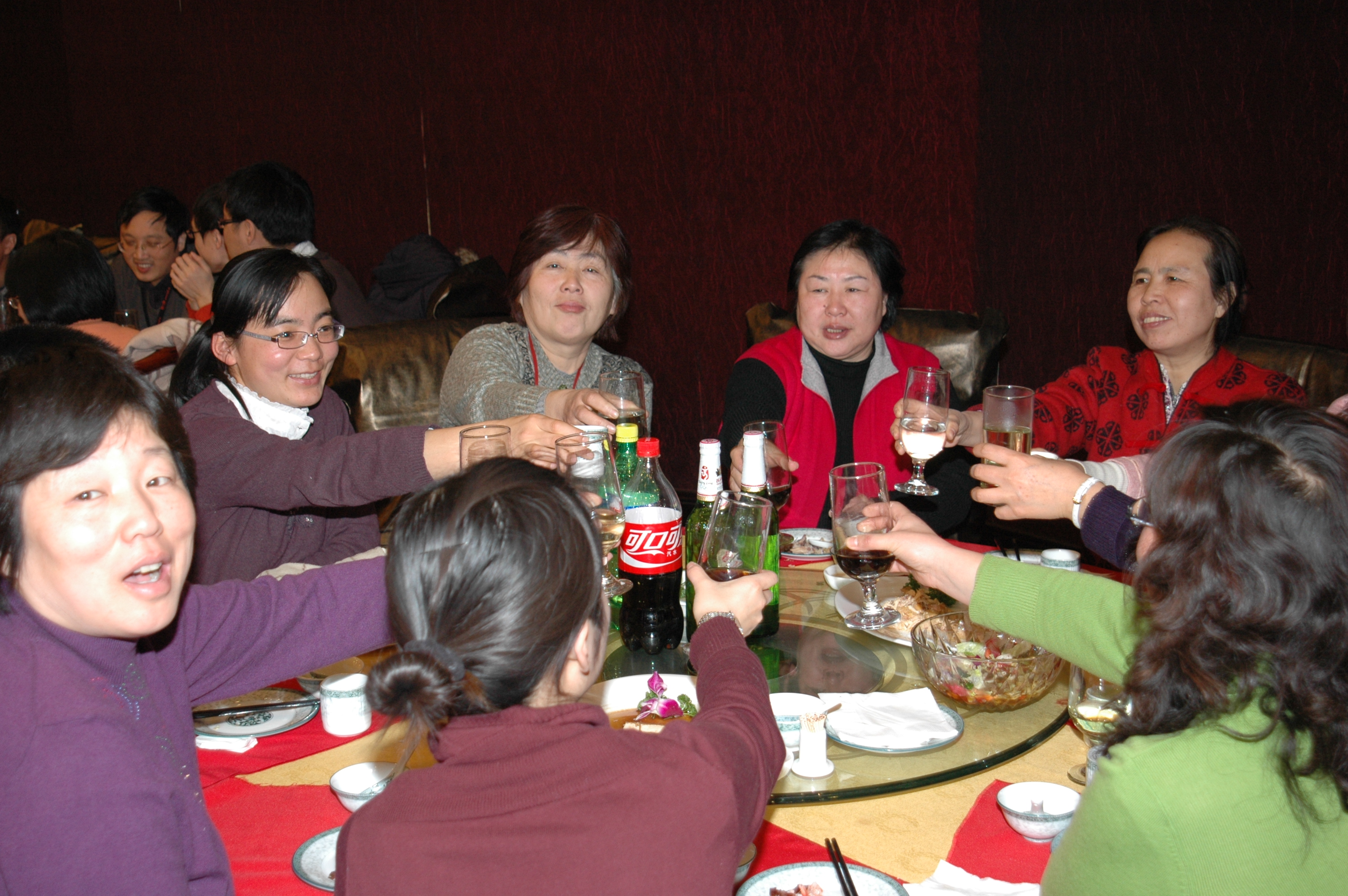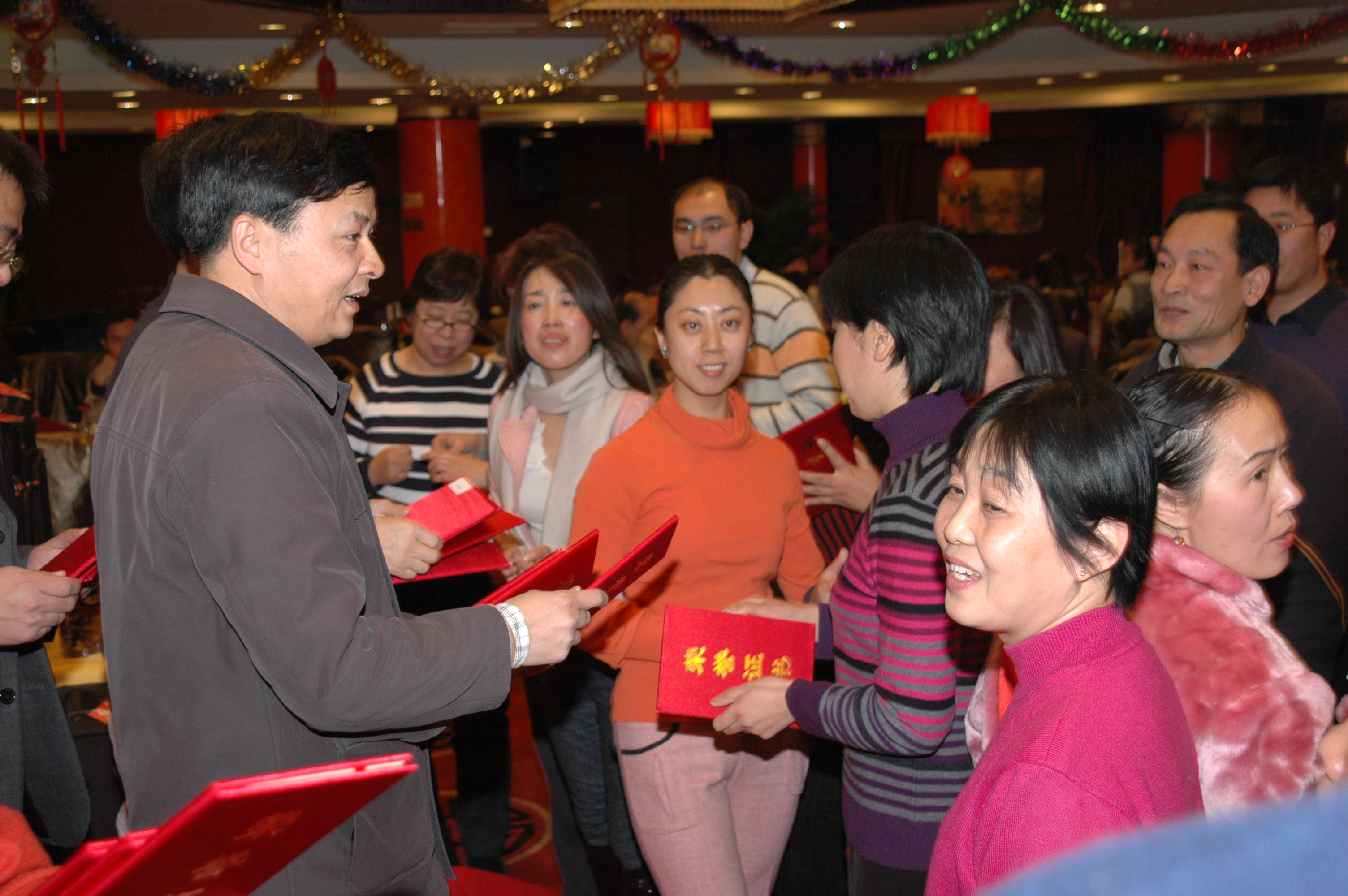 表演节目的过程中还穿插有抽奖活动。整个会场大堂里一直是欢声笑语、暖意融融,老师们聚在一起举杯共饮,欢笑畅谈,整个联谊会洋溢着祥和、欢乐的气氛。