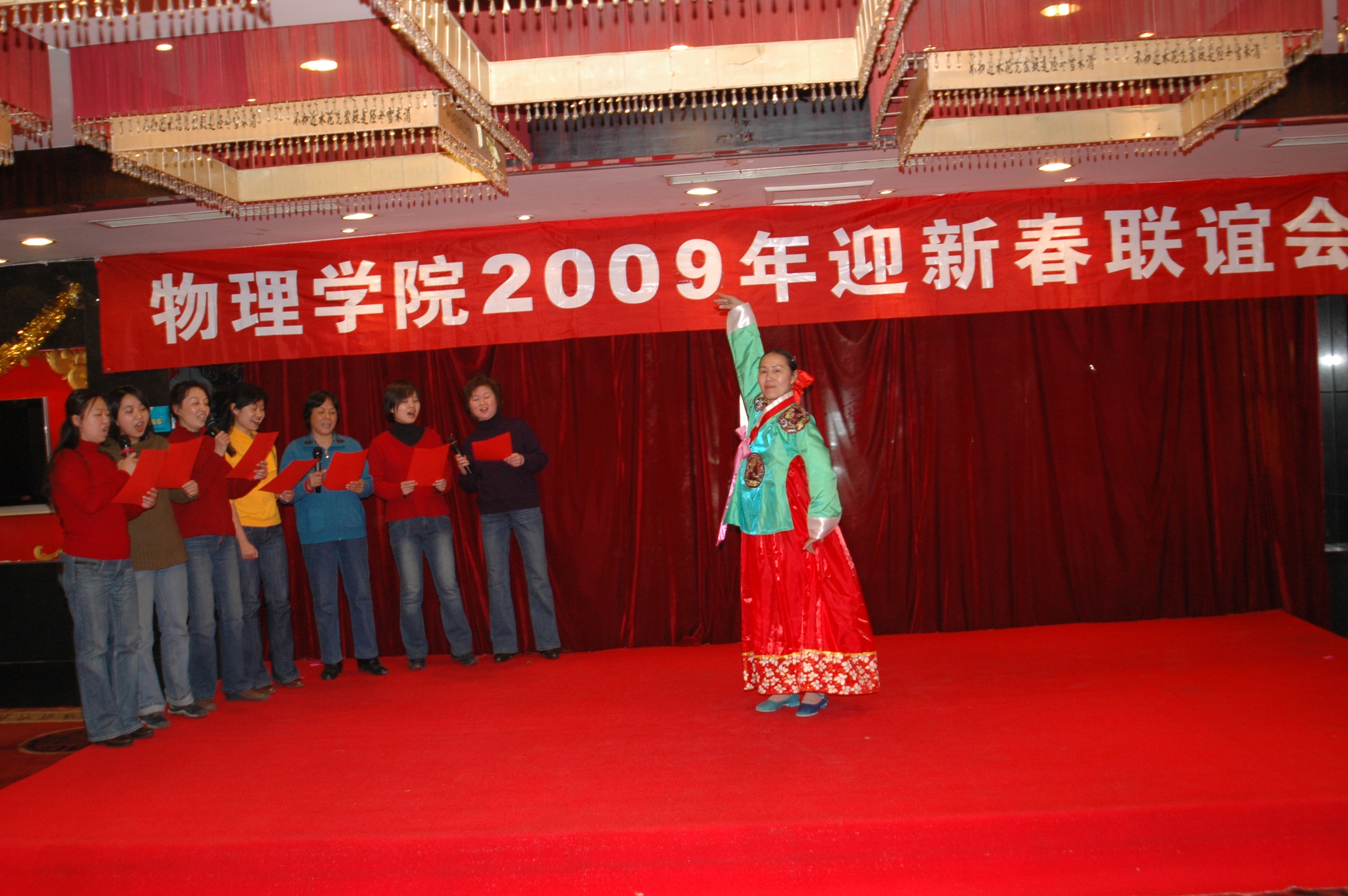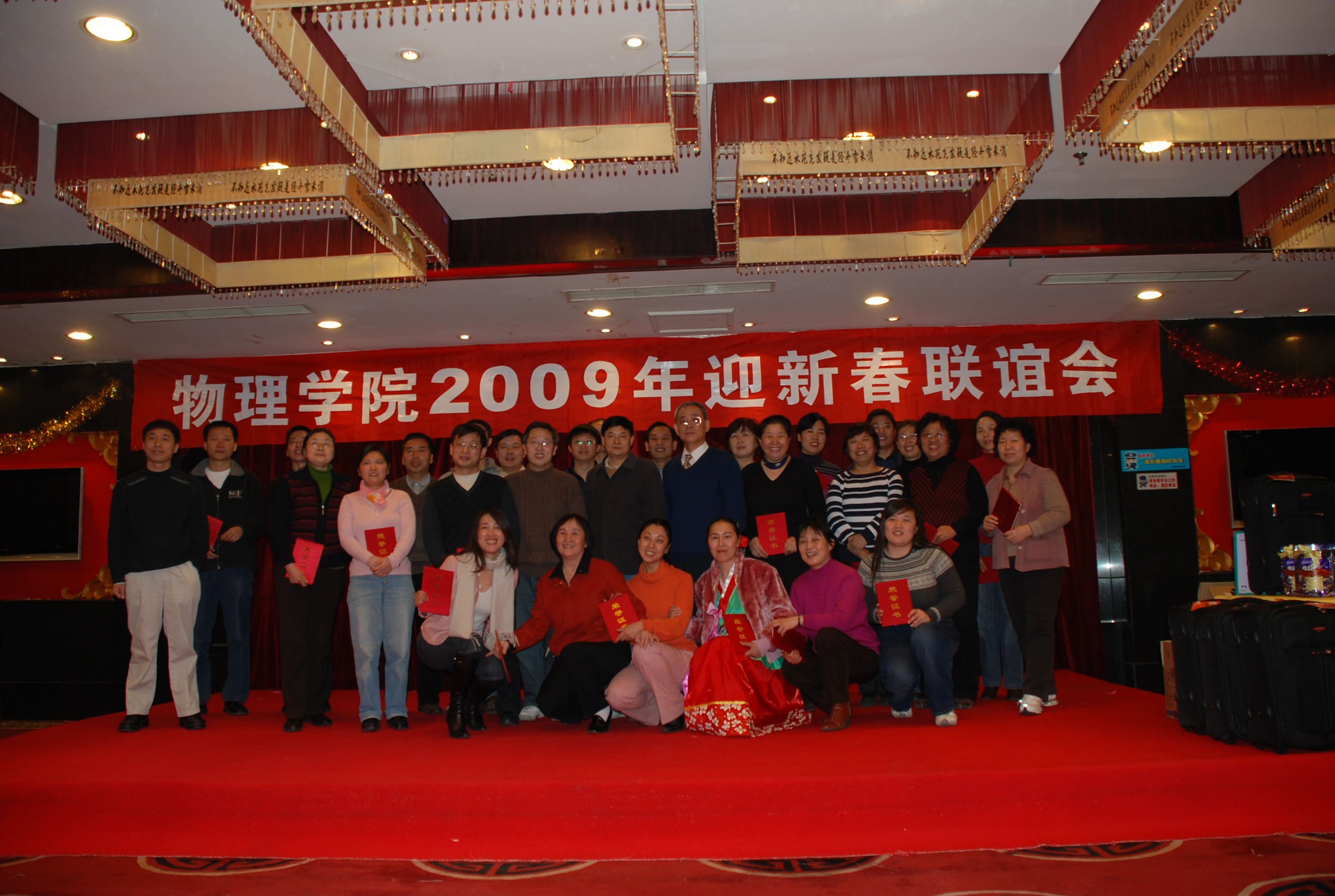 首先,开始精彩的文艺表演,行政工会小组的小合唱“我和你”歌声悠扬,好像奥运会开幕式壮观场面又浮现在眼前;院工会主席张亚伟老师宣读了本年度的院级工会工作积极分子的评选结果,由院党委工会负责人为评选出的工会积极分子颁发证书和奖品,目的在于表彰积极支持、组织、参与工会的各项有关活动;积极参加校工会组织的各项文艺体育等方面的活动,如运动会、各项赛事、文艺表演等;积极参加我院工会组织的各项活动的同志,推动今后活动的开展使我院的工会工作越来越好,大家并在一起合影留念。李俊老师翩翩起舞,熟悉的“大长今”优美音乐回荡在整个大厅,大气系胡永云教授为大家献上了一首“北国之春”,歌声一落掌声响起。