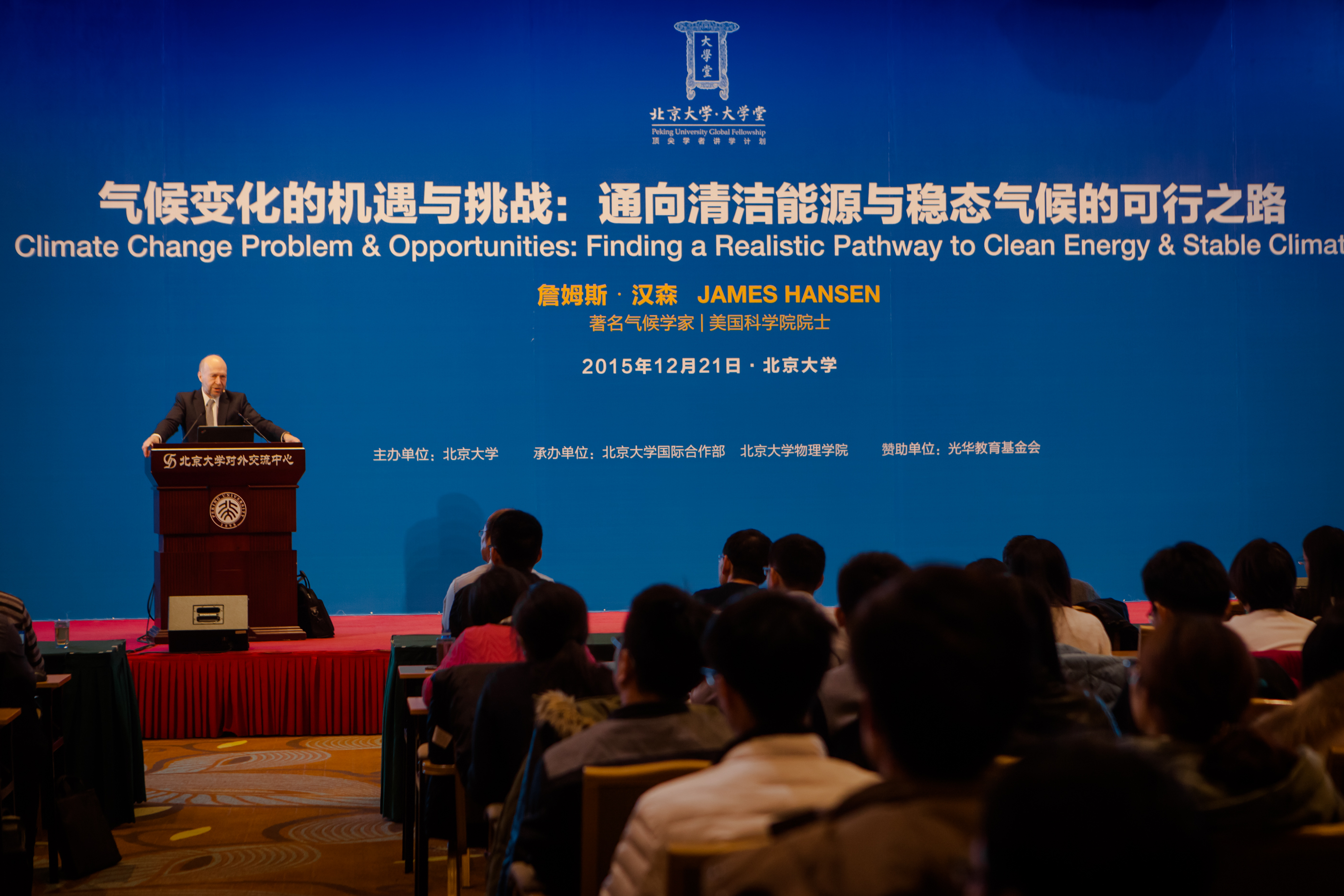 在讲座中,汉森教授对在场青年学者的热情表示赞赏和钦佩,他说:“在座的各位都是中国未来的领袖,我想留出一些时间来和年轻人们交流……因为这关系到你们的未来”。汉森教授使用极具说服力的数字和图片阐明了当下气候变化的严峻现实,这和空气污染问题交织在一起,既是一个极大的考验,也是中国在新能源和其他环保领域的机遇。他提到,放任气候变化发展将是上一代人对下一代的不公平,也是发达国家对发展中国家的不公平。因为气候变化是累积性的效应,发达国家几百年工业化进程中所排放的二氧化碳占据了目前大气中人为排放的大部分。物种灭绝、冰盖融化、海平面上升以及极端天气的增加可谓证据确凿,大自然的这些信号已经向我们敲响了警钟。之后,汉森教授深入浅出地介绍了气候变化的原因和物理化学背景,同时提出了他的一些建议和解决方案,如碳费的征收和返还机制、新一代核能的推广等等。