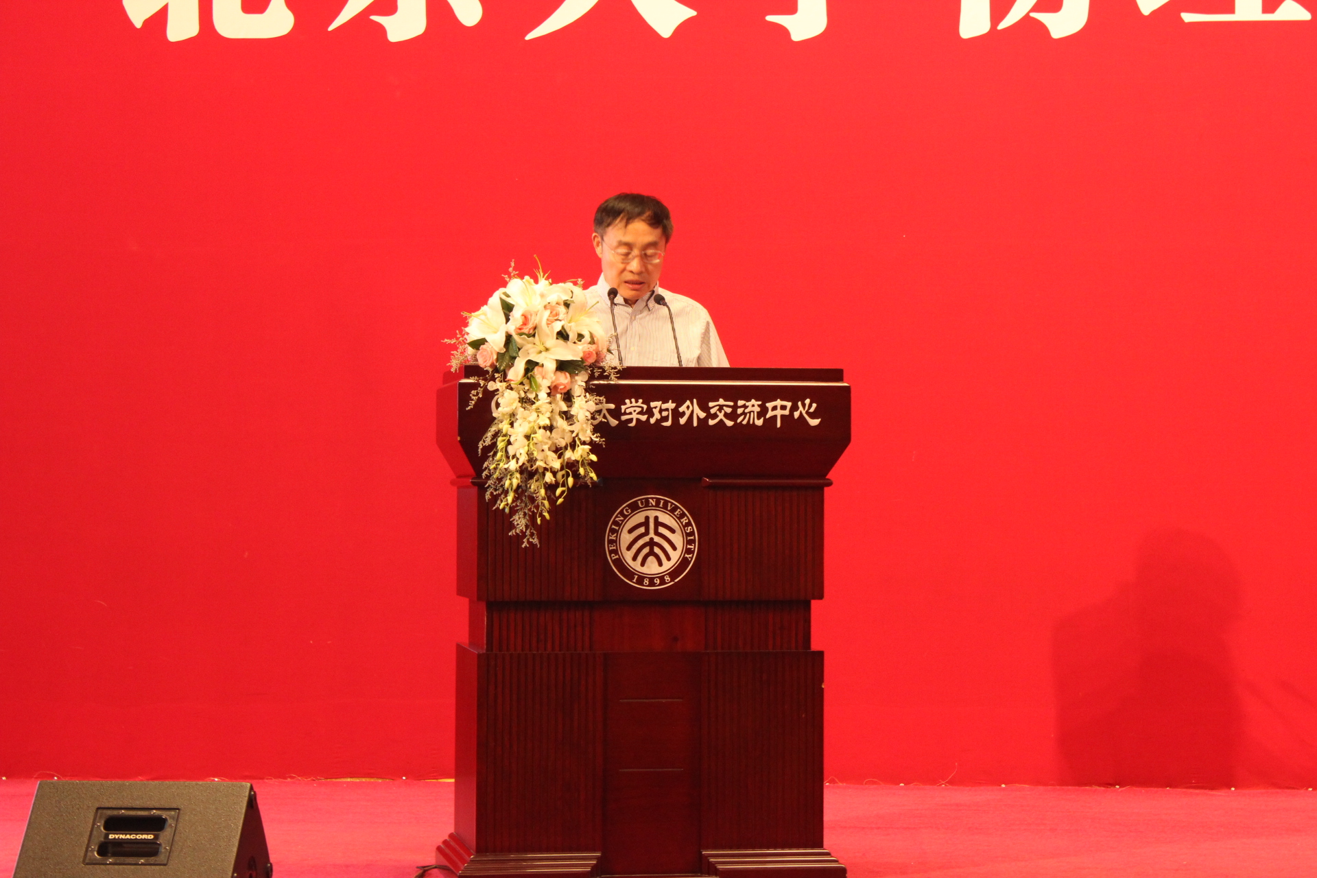 谢心澄院长首先代表学院致辞。他对同学们加入北大物院这个团结友爱的大家庭表示由衷的祝贺和热烈的欢迎。承接典礼开始前播放的《物理百年》纪录片,谢院长简要回顾了北大物理学科建立百年来的沧桑变换及其取得的举世瞩目的骄人成绩。同时,谢院长也指出,得益于经济发展、社会进步,物理人的科研环境得到极大改善,无需再置身沙漠、隐姓埋名,而可以安坐实验室追求纯粹的科学。他嘱托同学们一定要秉承历史的传承,不辜负前辈的努力,创造北大物理新的辉煌。