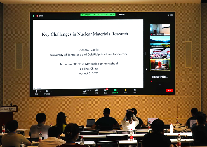 本期暑期学校以“核能材料的辐照损伤效应”为主题,邀请美国国家工程院院士Steven Zinkle教授、美国能源部欧内斯特·奥兰多·劳伦斯奖(Ernest Orlando Lawrence Award)获得者Brian Wirth教授、密歇根大学高飞教授、瑞士保罗谢勒研究所戴勇博士、加拿大皇后大学姚仲文教授、欧冠官方网站王宇钢教授、北京科技大学万发荣教授、中国科学院合肥物质科学研究院等离子体物理研究所罗广南研究员、湖南大学邓辉球教授、四川大学胡逊祥教授、上海交通大学沈耀教授、中国科学院高能物理研究所曹兴忠研究员等十余位国内外知名专家,全面、详细地讲授了核能材料领域的相关课程,涵盖载能粒子与物质相互作用的基本规律、材料辐照损伤的产生和演化、当前核能材料面临的挑战、数值模拟在核能领域里的应用、核能材料的测试和表征手段等基础知识、基础研究进展及战略高技术层面的急迫需要和长远需求,内容翔实,突出前沿,令学员们受益匪浅,收获颇丰。