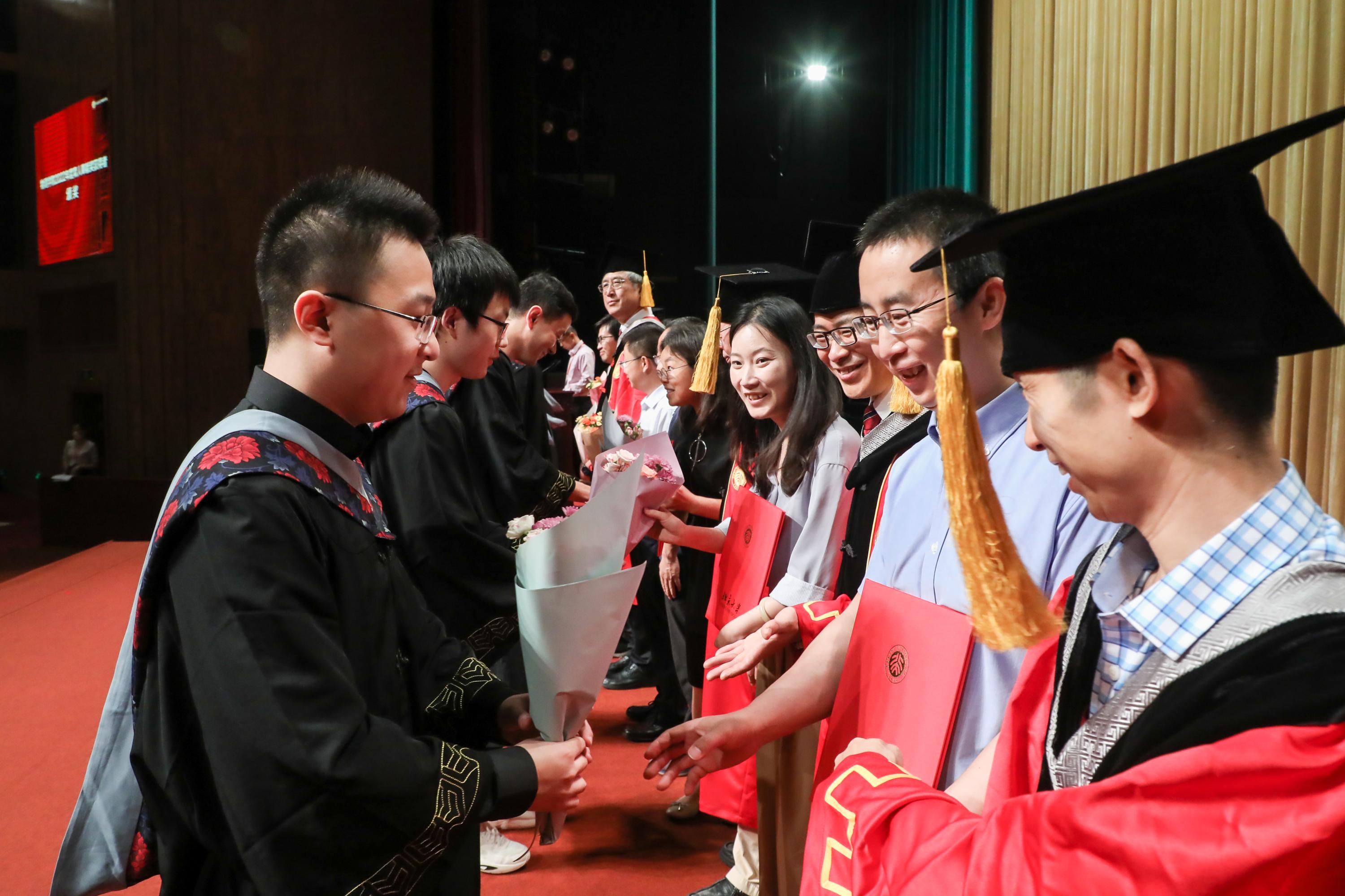 在随后的学位授予仪式上,高原宁、刘玉鑫、王宇钢、曹庆宏、彭良友、颜学庆、李焱、李新征为到场的2022届毕业生一一拨穗,颁发学位证书,并与他们合影留念。