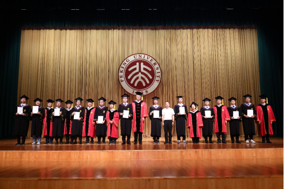 演唱过后,举行学位授予仪式。高原宁、曹庆宏、颜学庆、孟智勇、李焱、黎卓、马文君、唐宁为到场的2023届毕业生一一拨穗,颁发学位证书,并与同学们合影留念。
