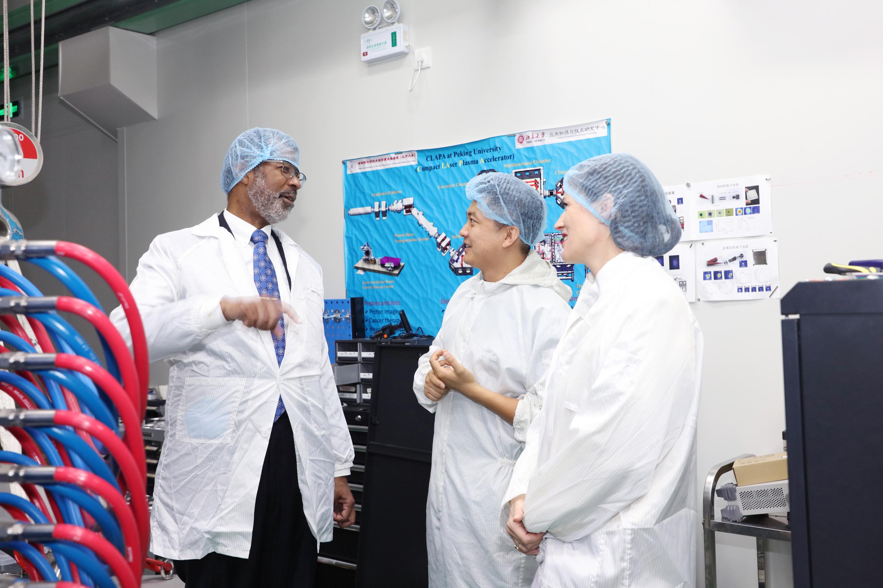麦格伍德(左一)、帕洛斯(右一)在激光等离子体实验室与耿易星(右二)交流