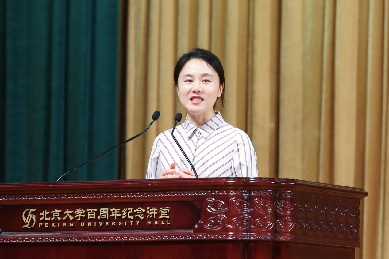 作为教师代表,俞妍老师祝贺同学们达成了上一个阶段的目标,也提醒新同学进入北大即将面临的困难和挑战。俞老师提到人生是高度非线性的。大学没有适用于每一位同学的固定成长路径。同学们需要自己去探索、去进行个性化的选择。俞老师表示在北大遇到的挑战是挖掘个人潜力的机会,要享受过程,热爱生活。